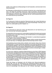 straßen. Die Landkreise sind Baulastträger für die Kreisstraßen, die Gemeinden für die Gemeindestraßen. Bei Radwegen als Bestandteil der touristischen Infrastruktur des Landes Brandenburg sind in der Regel die jeweiligen Kommunen Träger der Baulast. Die Baulast kann jedoch auch beim Landkreis, der Forstbehörde oder der Wasserwirtschaftsverwaltung (z.B. Radwege auf Deichen) liegen. Derjenige, der den Verkehrsweg bereitstellt, ist für die Verkehrssicherung verantwortlich. Zu Frage 6.2: Zur Ermittlung der Anteile am gesamten Radverkehrsnetz des Landes Brandenburg wäre die Einbeziehung der Wegelängen aller übrigen Baulastträger notwendig. Dazu liegen der Landesregierung keine Angaben vor. Zu Frage 6.3: Die Landesregierung steht dem Ausbau des Radverkehrs für die Naherholung und den Tourismus sehr wohlwollend gegenüber. Ein wesentlicher Schutzzweck der Landschaftsschutzgebiete Brandenburgs ist gerade die Förderung der naturnahen Erholung, des Fremdenverkehrs und naturbezogenen touristischen Nutzungen. Die Planung und der Bau von Radwegen führt deshalb in Landschaftsschutzgebieten in der Regel zu keinen größeren Problemen. Innerhalb von Naturschutzgebieten gibt es dagegen äußerst sensible Naturbereiche, die auch beim Bau von Radwegen gebührend berücksichtigt werden müssen. Schutzgebiete grenzen häufig direkt an Straßen oder beziehen diese mit ein. Bei der Anlage parallel zur Straße verlaufender Radwege ist somit stets eine Betroffenheit von Schutzgebieten gegeben. Nach dem Bundesnaturschutzgesetz (BNatSchG) und dem Brandenburgischen Naturschutzgesetz (BbgNatSchG) sind in Schutzgebieten bei der Planung zur Erlangung des Baurechts besondere rechtliche Anforderungen in Abhän- gigkeit vom Status des Gebietes zu beachten. So ist bei einer möglichen erheblichen Beeinträchtigung eines Natura-2000-Gebietes eine besondere Verträglichkeitsuntersuchung (§ 19c BNatSchG) notwendig. Abhängig von der Schutzgebietskategorie und der Länge der Beanspruchung des Gebiets sind bei Radwegen an Landesstraßen ab einem Schwellenwert (§ 38, Abs. 3 BbgStr.G) Umweltverträglichkeitsprüfungen (UVP) nach § 3 UVPG erforderlich. Bei Radwegen an Bundesstraßen ist im Einzelfall abzuprüfen, ob eine UVP erforderlich ist. Wenn eine UVP durchgeführt werden muss, ist regelmäßig ein Planfestellungs- bzw. -genehmi- gungsverfahren notwendig. Soweit die Anlage von Radwegen unter die Verbote einer Naturschutzgebietsver- ordnung fällt, und nach der Entscheidung der Straßenbauverwaltung kein konzen- trierendes Planfeststellungs- bzw Plangenehmigungsverfahren durchgeführt wird, muss der Baulastträger eine Befreiung von den Verboten beantragen. Zuständig