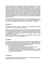 hierfür ist die Oberste bzw. Untere Naturschutzbehörde. Hat der Beirat bei der unteren Naturschutzbehörde einer beabsichtigten Befreiung widersprochen, ist für deren Erteilung die Zustimmung der obersten Naturschutzbehörde erforderlich. Soweit die Anlage von Radwegen unter den Genehmigungsvorbehalt einer Landschaftsschutz- gebietsverordnung fällt, muss bei Verzicht auf Planfeststellung oder Plangenehmigung eine solche Genehmigung eingeholt werden. Der gemeinsame Runderlass von MUNR und MSWV vom 05.01.1998 zur „Berücksichtigung der naturschutzrechtlichen Rege- lungen beim Neubau, Ausbau und bei der Unterhaltung von Straßen“ enthält jedoch vereinfachte Regelungen bei Maßnahmen der Straßenbauverwaltung innerhalb des vorhandenen Straßenkörpers, die in Naturschutz- bzw. Landschaftsschutzgebieten ausgeführt werden. Die Probleme beim Bau resultieren weniger aus der Schutzgebietskategorie als aus der Ausstattung des Untersuchungsraums mit schützenswerten Biotoptypen und Tieren (z.B. Feuchtgebiete oder Baumreihen). Siehe auch Antwort zu Frage 6.4. Zu Frage 6.4: Radwegeprojekte, deren Umsetzung aufgrund von Schutzgebietsbestimmungen stagnieren, sind der Landesregierung nicht bekannt. Konflikte können immer dann auftreten, wenn besonders schützenswerte Lebens- räume von Pflanzengesellschaften und Tieren durch den Radwegebau betroffen sind (z.B. Feuchtgebiete mit Amphibien). Solche Bereiche sollten daher bei der Planung von Radwegen umfahren werden. Auch der Bau von Radwegen parallel zu Alleen erfordert besondere Umsicht. Konflikte können auftreten, wenn Radwege in Schutzgebieten auf Wegen geführt werden, die auch dem Autoverkehr gewidmet sind. Zu Frage 6.5: Die finanzielle Kostenbelastung innerhalb wie außerhalb von Schutzgebieten wird durch die Betroffenheit von schützenswerten Biotopen und Lebensräumen beeinflusst. Während in Schutzgebieten überwiegend keine Mehrkosten zu verzeichnen sind, kann es in Einzelfällen zu folgenden erhöhten Aufwendungen kommen: - für Baustelleneinrichtungen und -ablauf, - für den Winterdienst auf Grund der Untersagung salzhaltiger Taumittel, - für konstruktive Vorkehrungen (Aufständerungen, Bauwerke) - und zusätzliche Untersuchungen im Rahmen der Planung (Flora-Fauna-Habitat (FFH)-Verträglichkeit, Biotopkartierung, faunistische Untersuchungen, pflanzen- soziologische Untersuchungen). Zu Frage 6.6: Der Anteil der Ausgleichs- und Ersatzmaßnahmen an der Investitionssumme beträgt durchschnittlich 10%, in Einzelfällen bis zu 20%.