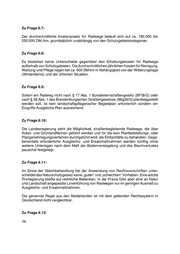Zu Frage 6.7: Der durchschnittliche Kostenansatz für Radwege beläuft sich auf ca. 180.000 bis 250.000 DM./km, grundsätzlich unabhängig von den Schutzgebietskategorien. Zu Frage 6.8: Es bestehen keine Unterschiede gegenüber den Erhaltungskosten für Radwege außerhalb von Schutzgebieten. Die durchschnittlichen jährlichen Kosten für Reinigung, Wartung und Pflege liegen bei ca. 600 DM/km in Abhängigkeit von der Witterungslage (Winterdienst) und der örtlichen Situation. Zu Frage 6.9: Sofern ein Radweg nicht nach § 17 Abs. 1 Bundesfernstraßengesetz (BFStrG) oder nach § 38 Abs. 1 des Brandenburgischen Straßengesetzes (BbgStrG) planfestgestellt werden soll, ist kein landschaftspflegerischer Begleitplan erforderlich sondern ein Eingriffs-Ausgleichs-Plan ausreichend. Zu Frage 6.10: Die Landesregierung sieht die Möglichkeit, straßenbegleitende Radwege, die über Acker- und Grünlandflächen geführt werden und für die kein Planfeststellungs- oder Plangenehmigungsverfahren durchgeführt wird, als Einfachfälle zu behandeln. Gege- benenfalls erforderliche Ausgleichs- und Ersatzmaßnahmen werden künftig ohne weitere Unterlagen nach dem Maß der Bodenversiegelung und des Baumverlustes pauschal festgelegt. Zu Frage 6.11: Im Sinne der Gleichbehandlung bei der Anwendung von Rechtsvorschriften unter- scheidet das Naturschutzgesetz keine „guten“ und „schlechten“ Vorhaben. Eine solche Privilegierung stieße auf rechtliche Bedenken. In der Praxis führt aber eine an Natur und Landschaft angepasste Linienführung von Radwegen nur im geringen Ausmaß zu Ausgleichs- und Ersatzmaßnahmen. Die genannte Regel aus den Niederlanden ist mit dem geltenden Rechtssystem in Deutschland nicht vergleichbar. Zu Frage 6.12: Ja.