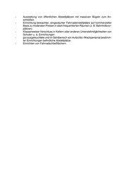 - Ausstattung von öffentlichen Abstellplätzen mit massiven Bügeln zum An- schließen - Einrichtung bewachter, eingezäunter Fahrradeinstellplätze auf kommerzieller Basis zu moderaten Preisen in stark frequentierten Räumen (z. B. Bahnhofsvor- plätzen) - Klassenweiser Verschluss in Kellern oder anderen Unterstellmöglichkeiten von Schulen u. ä. Einrichtungen - gut ausgeleuchtete und im Sichtbereich von Aufsichts-/Wachpersonal bestimm- ter Einrichtungen befindliche Abstellplätze - Einrichten von Fahrradschließfächern.