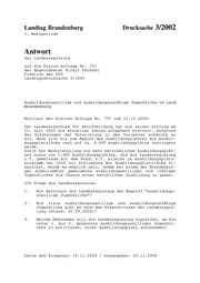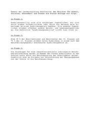 Landtag Brandenburg Drucksache 3/2002 3. Wahlperiode Antwort der Landesregierung auf die Kleine Anfrage Nr. 757 der Abgeordneten Birgit Fechner Fraktion der DVU Landtagsdrucksache 3/1845 Ausbildungsunwillige und ausbildungsunfähige Jugendliche im Land d Brandenburg Wortlaut der Kleinen Anfrage Nr. 757 vom 12.10.2000: Der Landesausschuss für Berufsbildung hat auf seiner Sitzung am 13. Juli 2000 die aktuellen Zahlen eingehend erörtert. Aufgrund der Erfahrungen der Entwicklung in den Vorjahren schätzte er ein, dass sich bis zum Beginn des Ausbildungsjahres die Ausbil- dungsplatzlücke real auf ca. 6.000 Ausbildungsplätze verringern werde. Durch die Bereitstellung von mehr betrieblichen Ausbildungsplät- zen sowie von 5.900 Ausbildungsplätzen, die die Landesregierung z.T. gemeinsam mit dem Bund, z.T. alleine im Ausbildungsplatz- programm Ost 2000 zur Schließung der Ausbildungsplatzlücke fi- nanziert, werde es möglich sein, jedem bei einem der Brandenbur- ger Arbeitsämter gemeldeten ausbildungswilligen und -fähigen Jugendlichen die Chance einer beruflichen Ausbildung zu geben. Ich frage die Landesregierung: 1. Wie definiert die Landesregierung den Begriff "ausbildungs- unwillige Jugendliche"? 2. Wie viele ausbildungsunwillige und ausbildungsunfähige Jugendliche gibt es nach den Erkenntnissen der Landesregie- rung (Stand: 30.09.2000)? 3. Welche Maßnahmen will die Landesregierung ergreifen, um die unter 1. bis 2. genannten ausbildungsunwilligen Jugendli- chen zu motivieren, einen Ausbildungsplatz anzunehmen? Datum des Eingangs: 14.11.2000 / Ausgegeben: 20.11.2000