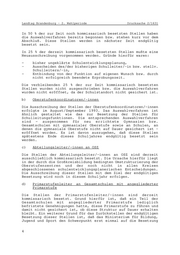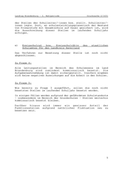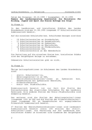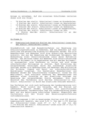Landtag Brandenburg - 2. Wahlperiode Drucksache 2/1631 Datum des Eingangs: 20.10.1995 / Ausgegeben: 25.10.1995 Namens der Landesregierung beantwortet die Ministerin für Bildung, Jugend und Sport die Kleine Anfrage wie folgt: Zu Frage 1: In den Landkreisen und kreisfreien Städten des Landes Brandenburg sind per 01.08.1995 insgesamt 67 Schulleiterstellen kommissarisch besetzt. Auf die einzelnen Schulstufen bzw. Schulformen bezogen sind dies - 19 Schulleiterstellen an Grundschulen, - 17 Schulleiterstellen an Gesamtschulen, - 6 Schulleiterstellen an Gymnasien, - 6 Schulleiterstellen an Realschulen, - 10 Schulleiterstellen an Förderschulen, - 8 Schulleiterstellen OSZ, - 1 Schulleiterstelle an der Abendschule Die Verteilung auf die einzelnen Kreise bzw. kreisfreien Städte sind der beigefügten Anlage zu entnehmen. Unbesetzte Schulleiterstellen gibt es nicht. Zu Frage 2: Übrige Leitungsfunktionen im Schulwesen des Landes Brandenburg sind: - stellv. Schulleiter/-in, - Abteilungsleiter/-in an OSZ, - Oberstufenkoordinatoren/-innen an Gymnasien bzw. Gesamtschulen mit gymnasialer Oberstufe, - Primarstufenleiter, - Kreis- bzw. Stadtschulräte. Kommissarisch besetzt ist zur Zeit die Stelle des Kreisschulrates des staatlichen Schulamtes für den Landkreis Havelland. Alle anderen Stellen der Kreis-/Stadtschulräte sind endgültig besetzt. Des weiteren sind die Stellen der Abteilungsleiter/-innen (insgesamt 120) an OSZ und die Stellen der Primarstufenleiter/- innen (insgesamt 84) an Gesamtschulen mit angegliederter Primarstufe kommissarisch besetzt. 27 Stellen der Oberstufenkoordinatoren/-innen sind landesweit kommissarisch besetzt sowie 165 Stellen der stellv. Schulleiter/-innen. Die Verteilung auf die Landkreise bzw. kreisfreien Städte im einzelnen sind wiederum der beigefügten 2