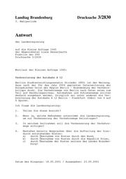 Landtag Brandenburg Drucksache 3/2830 3. Wahlperiode Antwort der Landesregierung auf die Kleine Anfrage 1045 der Abgeordneten Liane Hesselbarth Fraktion der DVU Drucksache 3/2636 Wortlaut der Kleinen Anfrage 1045: Verbreiterung der Autobahn A 12 Berlins Stadtentwicklungssenator Strieder (SPD) ist der Meinung, dass nach der für das Jahr 2004 geplanten Osterweiterung der Europäischen Union der Region Berlin - Brandenburg der Verkehrs- kollaps droht. Die Verkehrswege von Berlin nach Osten seien zum Teil auf Nachkriegsniveau. Autobahnen und Schienenwege sollten deshalb ausgebaut werden. Dringlich sei unter anderen die Ver- breiterung der Autobahn A 12 Berlin - Frankfurt (Oder) von 4 auf 6 Spuren. Ich frage die Landesregierung: 1. Teilen Sie diese Ansicht? 2. Wenn ja, welche Maßnahmen unternimmt die Landesregierung, um zur Verbesserung der Verkehrswege beizutragen? 3. In welchem Zeitrahmen soll die Verbesserung der Verkehrs- wege erfolgen? 4. Bestehen bereits Absprachen über die Aufteilung der hier- durch entstehenden Kosten: a) durch Übernahme von Kosten durch den Bund, b) durch Übernahme von Kosten durch die Republik Polen, c) durch Übernahme der Kosten seitens des Landes Branden- burg? Datum des Eingangs: 18.05.2001 / Ausgegeben: 23.05.2001