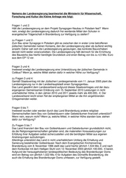 Landtag Brandenburg Drucksache 5/3788 5. Wahlperiode Antwort der Landesregierung auf die Kleine Anfrage 1481 des Abgeordneten Jens Lipsdorf FDP-Fraktion Drucksache 5/3641 Bau von Synagogen im Land Brandenburg Wortlaut der Kleinen Anfrage 1481 vom 14.07.2011: Die Landesregierung bekennt sich zu einem Neubau einer Synagoge im Land Brandenburg und hat bereits Mittel für einen Synagogen-Neubau in Potsdam zugesagt. Derzeit ist das Projekt wegen offensichtlicher Diskrepanzen gestoppt. Gleichzeitig hat nun die jüdische Gemeinde in Cottbus ebenfalls Pläne für einen Synagogen-Neubau. Die jüdische Gemeinde Cottbus hat nach eigenen Angaben etwa 1000 Mitglieder. Ich frage daher die Landesregierung: 1. Hält die Landesregierung an dem Projekt Synagogen-Neubau in Potsdam fest? 2. Wenn nein, erwägt die Landesregierung dadurch frei werdende Mittel den Schulen in evangelischer Trägerschaft in Brandenburg zur Verfügung zu stellen? 3. Inwieweit erwägt die Landesregierung eine Unterstützung der jüdischen Gemeinde in Cottbus? 4. Wenn ja, welche Mittel stehen dafür in welcher Höhe zur Verfügung? 5. Inwieweit wurden oder werden durch das Land Brandenburg andere religiöse Gemeinschaften beim Bau von Gotteshäusern oder Gebetsräumen finanziell unterstützt? 6. Wenn nein, warum nicht? 7. Wenn ja, welche Mittel, in welcher Höhe standen bzw. stehen dafür zur Verfügung? Datum des Eingangs: 12.08.2011 / Ausgegeben: 17.08.2011