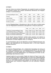 zu Frage 2: Nach den Zahlen der amtlichen Pflegestatistik, die zweijährlich jeweils zum Stichtag 15. Dezember erhoben wird, bestand nachstehende Altersstruktur der Pflegebe− dürftigen im Land Brandenburg: Leistungsempfänger/−innen 1999 in % 2001 in % 2003 in % Gesamt 64.340 100,0 67.821 100,0 69.266 100,0 unter 65 Jahre 14.963 23,3 14.649 21,6 13.885 20,1 65 bis unter 80 Jahre 18.967 29,5 20.096 29,6 21.361 30,8 80 Jahre und älter 30.410 47,3 33.076 48,8 34.020 49,1 Von den Pflegebedürftigen in Brandenburg im Alter von 65 Jahren und älter werden nach der Pflegestatistik nachstehende Leistungsformen in Anspruch genommen: 1999 in % 2001 in % 2003 in % Anzahl der Leistungsempfänger/−innen 49.377 100,0 53.172 100,0 55.381 100,0 Ausschließlicher Bezug von Pflegegeld 21.746 44,0 22.079 41,5 21.756 39,3 Bezug von ambulanten Pflegesachleistungen 13.702 27,8 15.752 29,6 16.726 30,2 Bezug von stationären Sachleistungen 13.929 28,2 15.341 28,9 16.899 30,5 Da der Begriff "betreute Wohnform" rechtlich weder geschützt noch definiert ist, stehen keine statistischen Angaben über die Anzahl der Angebote und die Anzahl der Menschen, die diese Angebote nutzen, zur Verfügung. Im Land Brandenburg gibt es drei Altenheime, die keine Pflegeeinrichtungen sind, jedoch in den Geltungsbereich des Heimgesetzes fallen. In ihnen leben insgesamt 299 ältere Menschen. zu Frage 3: Der Anteil der Pflegebedürftigen, die in vollstationärer Dauerpflege sind, betrug am 15.12.2003 in Brandenburg 24,5 %, im Bundesdurchschnitt 29,5 %. Der hohe Anteil der ambulanten Versorgung geht nach Einschätzung der Landesregierung nicht unwesentlich auf die hohe Arbeitslosigkeit in der Altersgruppe der Kinder von pfle− gebedürftigen alten Menschen zurück. Insgesamt ergibt sich aus der zweiten Tabelle der Antwort auf Frage 2, dass in Be− zug auf die Betreuung älterer Pflegebedürftiger der Anteil reiner Angehörigenpflege seit 1999 nicht gestiegen ist, sondern vielmehr von 44,0 % auf 39,3 % in 2003 ge− sunken ist. Hohe Steigerungsraten weist dagegen die Nachfrage nach ambulanten Sachleistungen durch ambulante Pflegedienste und nach stationären Pflegeleis− tungen auf.