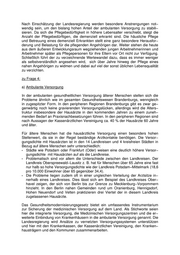 Nach Einschätzung der Landesregierung werden besondere Anstrengungen not− wendig sein, um den bislang hohen Anteil der ambulanten Versorgung zu stabili− sieren. Da sich die Pflegebedürftigkeit in höhere Lebensalter verschiebt, steigt die Anzahl der Pflegebedürftigen, die demenziell erkrankt sind. Die häusliche Pflege und Betreuung eines demenziell Erkrankten stellt eine ganz besondere Herausfor− derung und Belastung für die pflegenden Angehörigen dar. Weiter stehen die heute aus dem äußeren Entwicklungsraum wegziehenden jungen Arbeitnehmerinnen und Arbeitnehmer später als Pflegepersonen für ihre Eltern vor Ort nicht zur Verfügung. Schließlich führt der zu verzeichnende Wertewandel dazu, dass es immer weniger als selbstverständlich angesehen wird, sich über Jahre hinweg der Pflege eines nahen Angehörigen zu widmen und dabei auf viel der sonst üblichen Lebensqualität zu verzichten. zu Frage 4: a) Ambulante Versorgung In der ambulanten gesundheitlichen Versorgung älterer Menschen stellen sich die Probleme ähnlich wie im gesamten Gesundheitswesen Brandenburgs, wenngleich in zugespitzter Form. In den peripheren Regionen Brandenburgs gibt es zwar ge− genwärtig noch keine gravierenden Versorgungslücken, allerdings wird die Alters− truktur insbesondere der Hausärzte in den kommenden Jahren zu einem zuneh− menden Bedarf an Praxisnachbesetzungen führen. In den peripheren Regionen sind nach Aussagen der Kassenärztlichen Vereinigung ca. 40 % der Hausärzte 60 Jahre und älter. Für ältere Menschen hat die hausärztliche Versorgung einen besonders hohen Stellenwert, da sie in der Regel beständige Arztkontakte benötigen. Die Versor− gungsdichte mit Hausärzten ist in den 14 Landkreisen und 4 kreisfreien Städten in Bezug auf ältere Menschen sehr unterschiedlich: Städte wie Potsdam oder Frankfurt (Oder) weisen eine deutlich höhere Versor− gungsdichte mit Hausärzten auf als die Landkreise. Problematisch sind vor allem die Unterschiede zwischen den Landkreisen. Der Landkreis Oberspreewald−Lausitz z. B. hat für Menschen über 65 Jahre eine fast nur halb so hohe Versorgungsdichte wie der Landkreis Potsdam−Mittelmark (18,6 pro 10.000 Einwohner über 65 gegenüber 34,4). Die Probleme liegen zudem oft in einer ungleichen Verteilung der Arztsitze in− nerhalb eines Landkreises. Dies lässt sich am Beispiel des Landkreises Ober− havel zeigen, der sich von Berlin bis zur Grenze zu Mecklenburg−Vorpommern hinzieht. In den Berlin nahen Gemeinden rund um Oranienburg, Hennigsdorf, Hohen Neuendorf und Velten praktizieren drei Viertel der in diesem Landkreis zugelassenen Hausärzte. Das Gesundheitsmodernisierungsgesetz bietet ein umfassendes Instrumentarium zur Sicherung der medizinischen Versorgung auf dem Land. Als Stichworte seien hier die integrierte Versorgung, die Medizinischen Versorgungszentren und die er− weiterte Einbindung von Krankenhäusern in die ambulante Versorgung genannt. Die Landesregierung wird Ansätze zu vernetzten Versorgungssystemen unterstützen und hier mit den Krankenkassen, der Kassenärztlichen Vereinigung, den Kranken− hausträgern und den Kommunen zusammenarbeiten.