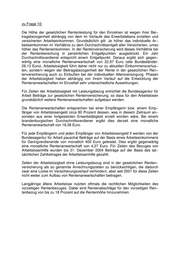zu Frage 10: Die Höhe der gesetzlichen Rentenleistung für den Einzelnen ist wegen ihrer Bei− tragsbezogenheit abhängig von dem im Verlaufe des Erwerbslebens erzielten und versicherten Arbeitseinkommen. Grundsätzlich gilt: Je höher das individuelle Ar− beitseinkommen im Verhältnis zu dem Durchschnittsentgelt aller Versicherten, umso höher das Renteneinkommen. In der Rentenversicherung wird dieses Verhältnis bei der Rentenberechung in persönlichen Entgeltpunkten ausgedrückt. Ein Jahr Durchschnittsverdienst entspricht einem Entgeltpunkt. Daraus ergibt sich gegen− wärtig eine monatliche Rentenanwartschaft von 22,97 Euro (alte Bundesländer: 26,13 Euro). Arbeitslosigkeit führt daher nicht nur zu aktuellen Einkommensverlus− ten, sondern wegen der Beitragsbezogenheit der Rente in der gesetzlichen Ren− tenversicherung auch zu Einbußen bei der individuellen Altersversorgung. Phasen der Arbeitslosigkeit haben abhängig von ihrem Verlauf auf die Entwicklung der Rentenanwartschaften im Einzelfall sehr unterschiedliche Auswirkungen. Für Zeiten der Arbeitslosigkeit mit Leistungsbezug entrichtet die Bundesagentur für Arbeit Beiträge zur gesetzlichen Rentenversicherung, so dass für den Arbeitslosen grundsätzlich weitere Rentenanwartschaften aufgebaut werden. Die Rentenanwartschaften entsprechen bei einer Empfängerin bzw. einem Emp− fänger von Arbeitslosengeld circa 80 Prozent dessen, was in diesem Zeitraum an− sonsten aus einer fortgesetzten Erwerbstätigkeit erzielt worden wäre. Bei einem brandenburgischen Durchschnittsverdiener ergibt dies derzeit eine monatliche Rentenanwartschaft von 18,38 Euro. Für jede Empfängerin und jeden Empfänger von Arbeitslosengeld II werden von der Bundesagentur für Arbeit pauschal Beiträge auf der Basis eines Arbeitseinkommens für Geringverdienende von monatlich 400 Euro geleistet. Dies ergibt gegenwärtig eine monatliche Rentenanwartschaft von 4,27 Euro. Für Zeiten des Bezuges von Arbeitslosenhilfe wurden bis 31. Dezember 2004 Beiträge auf der Basis des tat− sächlichen Zahlbetrages der Arbeitslosenhilfe gezahlt. Zeiten der Arbeitslosigkeit ohne Leistungsbezug sind in der gesetzlichen Renten− versicherung als so genannte Anrechnungszeiten zu berücksichtigen, die dadurch zwar eine Lücke im Versicherungsverlauf verhindern, aber seit 2001 für diese Zeiten nicht weiter zum Aufbau von Rentenanwartschaften beitragen. Langjährige ältere Arbeitslose nutzten oftmals die rechtlichen Möglichkeiten des vorzeitigen Rentenbezuges. Dabei sind Rentenabschläge für den vorzeitigen Ren− tenbezug von bis zu 18 Prozent auf die Rentenhöhe hinzunehmen.