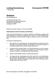 Landtag Brandenburg Drucksache 4/3108 4. Wahlperiode Antwort der Landesregierung auf die Kleine Anfrage 1193 der Abgeordneten Carolin Steinmetzer Fraktion der Linkspartei.PDS Drucksache 4/2975 Wortlaut der Kleinen Anfrage 1193 vom 24.05.2006: Straßenausbau zwischen Herzberg und Wiederau Zurzeit wird die Bundesstraße 101 zwischen Herzberg und Wiederau ausgebaut. Die schon bestehende und sehr gut ausgebaute B 101 soll nun in mehreren Abschnitten durch Überholspuren erweitert werden. Zusätzlich entsteht ein Rad- und Wirtschafts- weg. Ich frage die Landesregierung: 1. Wie bewertet die Landesregierung die Notwendigkeit des Ausbaus der Bun- desstraße 101 zwischen Herzberg und Wiederau? Zu welchem Ergebnis ist eine diesbezügliche Kosten-Nutzen-Analyse gekommen? 2. Inwieweit wurden aktuelle Zahlen zum Verkehrsaufkommen auf der Bundes- straße 101 zwischen Herzberg und Wiederau bei den bisherigen Untersu- chungen, Planungen und Entscheidungen berücksichtigt? 3. Welche Verkehrsbedarfe werden zukünftig prognostiziert? 4. Wie begründet die Landesregierung den Bau eines Rad- und Wirtschaftswe- ges entlang der Bundesstraße 101 zwischen Herzberg und Wiederau? Wurde der Bau eines separaten Radweges als Alternative in den Planungen berück- sichtigt? Wenn nein, warum nicht? Datum des Eingangs: 22.06.2006 / Ausgegeben: 28.06.2006