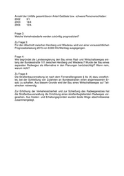 Anzahl der Unfälle gesamt/davon Anteil Getötete bzw. schwere Personenschäden: 2002 3/1 2003 14/4 2004 12/4. Frage 3: Welche Verkehrsbedarfe werden zukünftig prognostiziert? Zu Frage 3: Für den Abschnitt zwischen Herzberg und Wiederau wird von einer voraussichtlichen Prognosebelastung 2015 von 8.000 Kfz/Werktag ausgegangen. Frage 4: Wie begründet die Landesregierung den Bau eines Rad- und Wirtschaftsweges ent- lang der Bundesstraße 101 zwischen Herzberg und Wiederau? Wurde der Bau eines separaten Radweges als Alternative in den Planungen berücksichtigt? Wenn nein, warum nicht? Zu Frage 4: Die Straßenbauverwaltung ist nach dem Fernstraßengesetz § 8a (4) dazu verpflich- tet, bei der Schließung von Zufahrten an Bundesstraßen einen angemessenen Er- satz zu schaffen. Aus diesem Grunde wird der Bau eines Wirtschaftsweges auf Teil- strecken notwendig. Zur Erhöhung der Verkehrssicherheit und zur Schießung des Radwegenetzes hat die Straßenbauverwaltung die Errichtung eines straßenbegleitenden Radweges vor- gesehen. Aus Kosten- und Erhaltungsgründen wurden beide Wege abschnittsweise zusammengelegt.