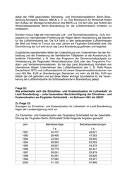dabei der 1998 gegründeten Marketing− und Informationsplattform Berlin−Bran− denburg Aerospace Alliance (BBAA) e. V. zu. Das Ministerium für Wirtschaft fördert den Aufbau der Managementstrukturen des BBAA u.a. mit dem Ziel, das Rufbild des Wirtschaftsstandortes Berlin−Brandenburg für die Luftfahrtindustrie erheblich zu verbessern. Darüber hinaus trägt die Internationale Luft− und Raumfahrtausstellung (ILA) kon− sequent zur internationalen Profilierung der Region Berlin−Brandenburg als Standort für die Luftfahrtindustrie bei. Die ILA zählt zu den bedeutendsten Luftfahrtmessen der Welt und findet im Turnus von zwei Jahren am Flughafen Schönefeld statt. Die Durchführung der ILA wird durch das Land Brandenburg gefördert und begleitet. Zusätzliches operationelles Mittel der Unterstützung von Unternehmen bei der An− siedlung und der Erweiterung der betrieblichen Tätigkeiten ist die Ausreichung öf− fentlicher Fördermittel, z. B. über das Programm der Gemeinschaftsaufgabe zur Verbesserung der Regionalen Wirtschaftsstruktur (GA) oder des Programms Pro− dukt− und Verfahrensinnovationen. So hat das Land Brandenburg Vorhaben von international tätigen Unternehmen des Luftfahrtbereichs wie z. B. Rolls−Royce Deutschland, MTU und Lufthansatechnik mit einem Gesamtinvestitionsvolumen von rund 425 Mio. EUR an Brandenburger Standorten mit mehr als 69 Mio. EUR aus Mitteln der GA gefördert und auf diese Weise wichtige Grundsteine für die Veran− kerung der Luftfahrtindustrie als Schlüsselbranche in Brandenburg gelegt. Frage 33: Wie entwickelte sich die Einnahme− und Kostensituation im Luftverkehr im Land Brandenburg − unter besonderer Berücksichtigung der Einnahme− und Kostensituation am Flughafen Schönefeld − im Zeitraum 1991 bis 2003? Zu Frage 33: Aussagen zur Einnahme− und Kostensituation im Luftverkehr im Land Brandenburg liegen der Landesregierung nicht vor. Zur Einnahme− und Kostensituation des Flughafens Schönefeld hat die Geschäfts− führung der Flughafen Berlin−Schönefeld GmbH folgende Angaben gemacht: Jahr Betriebserträge Betriebsaufwendungen T T 1991 34.707 48.621 1992 29.408 47.053 1993 33.540 54.805 1994 38.393 53.293 1995 39.557 54.375 1996 39.779 62.441 1997 39.291 53.879 1998 40.397 55.826 1999 37.082 53.921 2000 41.100 67.866