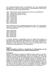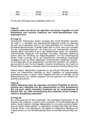 2001 38.945 65.040 2002 43.950 66.362 Für das Jahr 2003 liegen keine endgültigen Zahlen vor. Frage 34: Inwieweit sollen und können die regionalen und kleinen Flugplätze im Land Brandenburg eine sinnvolle Ergänzung zum Berlin−Brandenburger Flug− platzsystem sein? Zu Frage 34: Internationale Verbindungen werden vorrangig über Verkehrsflughäfen gesichert. Sie haben u. a. deswegen eine herausragende Bedeutung sowohl aus regionaler als auch aus bundesweiter Sicht für die Leistungsfähigkeit von Produktions− und Dienstleistungsunternehmen. Flughäfen bilden aber nur einen, wenn auch wichtigen Teil der Luftverkehrsinfrastruktur. Als Ergänzung zum internationalen Verkehrs− flughafen Berlin−Schönefeld ist ein in sich abgestimmtes System von Flugplätzen unterschiedlicher Kategorien und Qualitäten vorzuhalten. Besondere Bedeutung gewinnt dabei die Vorhaltung von Regionalflugplätzen. Von der Landesregierung werden hierbei vorrangig die für die luftverkehrliche Erschließung notwendigen Flugplätze mit sich aus dieser allgemeinen Verkehrsfunktion ableitenden besonde− ren Anforderungen an die Zugänglichkeit und Sicherheit betrachtet. Die Landesre− gierung steht für einen Teil der Aufgaben in direkter Verantwortung. Die Anzahl und Struktur dieser Flugplätze unterliegen daher einer besonders kritischen Betrachtung. Weiterer Bedarf, insbesondere ausgehend von der örtlichen Wirtschaft, dem Tou− rismus und luftsportlichen Interessen ist durch Flugplätze mit entsprechenden Zweckbestimmungen zu decken. Diese Flugplätze sind daher ein wichtiger Teil der Bodeninfrastruktur der Luftfahrt insgesamt. Sie sind planerisch und rechtlich ent− sprechend abzusichern. Frage 35: Welche Bedeutung haben die regionalen und kleinen Flugplätze für die Ent− wicklung des Luftsportes und der Luftsportvereine im Land Brandenburg? Wie und durch welche finanziellen Zuschüsse hat die Landesregierung im Zeitraum 1991 bis 2003 die Entwicklung des Luftsportes und der Luftsport− vereine in Brandenburg unterstützt? Zu Frage 35: Die Landesregierung hat dazu beigetragen, die notwendigen Bedingungen für die Ausübung des Luftsports zu sichern und zu entwickeln. Für die Brandenburger und Berliner werden dadurch vielfältige Möglichkeiten für eine aktive sportliche Betäti− gung auf diesem Gebiet geboten. In besonderem Interesse steht dabei die Förde− rung des Kinder− und Jugendsports. Der Bedarf an luftsportlicher Betätigung der Luftsportvereine aus der Bundeshauptstadt Berlin ist ebenfalls berücksichtigt wor− den.