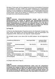 Mit diesen Förderungen soll eine abgestimmte territorial−wirtschaftliche Entwicklung von Flugplätzen und deren Umfeld, eine stabile Entwicklung der Flugplatzgesell− schaften und eine Ansiedlung von gewerblichen− und Dienstleistungsunternehmen, verbunden mit der Schaffung von Dauerarbeitsplätzen in verschiedenen Branchen, erreicht werden. Damit wird ein Beitrag zur Umsetzung des Integrierten Verkehrs− konzeptes des Landes Brandenburg geleistet Frage 38: Welche konkreten Infrastrukturmaßnahmen wurden nach der Luftver− kehrskonzeption des Landes im Rahmen des Operationellen Programms Brandenburg bisher im Zeitraum 2000 bis 2003 realisiert? Wie hoch war in diesem Zusammenhang der geplante und realisierte Einsatz von EU−Struk− turfondsmitteln? Wie schlüsseln sich diese Mittel im einzelnen auf? Wie be− wertet die Landesregierung die Effizienz der eingesetzten Mittel? Zu Frage 38: Im Rahmen des Operationellen Programms sind an drei Standorten Vorhaben rea− lisiert worden. Der Standort, die konkrete Maßnahme, sowie die beantragten und eingesetzten EFRE− Mittel sind in der folgenden Tabelle dargestellt. Die Vorhaben wurden in den Jahren 2001 bis 2003 realisiert. Sie sind abgeschlos− sen. Investitionsort/Maßnahme beantragte Mittel realisierte Mittel per 30.06.2003 Fehrbellin, Ausbau Verkehrslandeplatz 708.139,25 708.139,25 + "Ruppiner Land" Strausberg, Ausbau Verkehrslandeplatz 753.064,94 753.064,94 Strausberg 265.665,00 263.328,84 Ersatzneubau Befeuerungsanlage 1.018.729,94 1.016.393,78 Jänschwalde, Ausbau Verkehrslandeplatz Cott− 726.264,55 726.264,55 bus−Drewitz und Anbindung Ver− 978.075,00 617.463,00 kehrslandeplatz 1.704.339,50 1.343.727,55 Im Übrigen siehe hierzu Frage 27. Frage 39: Welche konkreten Infrastrukturmaßnahmen sollen nach der Luftverkehrs− konzeption des Landes im Rahmen des Operationellen Programms Branden− burg im Zeitraum 2003 bis 2006 noch realisiert werden? Wie hoch ist in die− sem Zusammenhang der geplante und ggf. bereits beantragte Einsatz von EU−Strukturfondsmitteln? Wie schlüsseln sich diese Mittel im einzelnen auf?