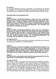 Zu Frage 39: Für die Jahre 2003/2004 sind keine Landesmittel für die Förderung des Ausbaus von Flugplätzen in den Haushalt eingestellt. Die vorgesehenen Mittel aus den EU− Strukturfonds sind zur Realisierung anderer Infrastrukturvorhaben verlagert worden. Zusammenarbeit mit der Republik Polen Frage 40: Welche konkreten Infrastrukturmaßnahmen wurden nach der Luftverkehrs− konzeption des Landes im Rahmen des Operationellen Programms Bran− denburg bisher im Zeitraum 2000 bis 2003 in Zusammenarbeit mit der Re− publik Polen realisiert? Wie hoch war in diesem Zusammenhang der geplante und realisierte Einsatz von EU−Strukturfondsmitteln? Wie schlüsseln sich diese Mittel im einzelnen konkret auf? Frage 41: Welche konkreten Infrastrukturmaßnahmen sollen nach der Luftverkehrs− konzeption des Landes im Rahmen des Operationellen Programms Branden− burg im Zeitraum 2003 bis 2006 in Zusammenarbeit mit der Republik Polen noch realisiert werden? Wie hoch ist in diesem Zusammenhang der geplante und ggf. bereits beantragte Einsatz von EU−Strukturfondsmitteln? Wie schlüsseln sich diese Mittel im einzelnen konkret auf? Zu Frage 40 und 41: Das Operationelle Programm Brandenburg beinhaltet ausschließlich die Förderung von Infrastrukturmaßnahmen im Land Brandenburg. Frage 42: Welche regionalen und kleinen Flugplätze in der Republik Polen werden in der Luftverkehrskonzeption des Landes Brandenburg als sinnvolle Ergänzung zum Flugplatzsystem der Region Berlin−Brandenburg und speziell zum Ver− kehrsflughafen Schönefeld angesehen? Welche Maßnahmen der Zusam− menarbeit mit Polen werden in diesem Zusammenhang bis 2004 realisiert? Frage 43: Wie bewertet die Landesregierung die bisherige Zusammenarbeit mit der Re− publik Polen auf dem Gebiet der Luftverkehrspolitik? Zu Frage 42 und 43: Nach Artikel 73 Ziffer 6 Grundgesetz hat der Bund die ausschließliche Gesetzge− bung im Bereich des Luftverkehrs. Nach Artikel 59 Absatz 2 Grundgesetz ist er weiterhin zuständig für Verträge, die die politischen Beziehungen des Bundes re− geln. Vor diesem Hinterrund besteht seit 1991 ein bilaterales Luftverkehrsabkom− men zwischen der Bundesrepublik Deutschland und der Republik Polen. Danach gehört Berlin zu den vier deutschen Flughafenstandorten, die von dem sonst frei− gestellten regionalen Linienverkehr mit Maschinen unter 70 Sitzen ausgenommen sind. Praktisch bedeutet dies, dass ausgehend von Berlin nur Flüge nach Warschau,