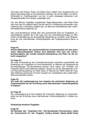 nicht aber nach Krakau, Posen und Zielona Gora möglich sind. Ausgenommen von diesen Beschränkungen ist die Destination Kattowitz, die einmal täglich von Berlin− Schönefeld im Frachtflugverkehr von der in Lublin ansässigen polnischen Luft− fahrtgesellschaften Exin Aviation angeflogen wird. Von den Berliner Flughäfen ausgehender Regionalflugverkehr nach West−Polen wird nach dem EU−Beitritt Polens und der damit zur Anwendung kommenden Libe− ralisierung des Luftverkehrs möglich sein, so dass eine Überarbeitung des Luftver− kehrsabkommens entbehrlich ist. Das Land Brandenburg verfügt über eine ausreichende Zahl von Flugplätzen un− terschiedlicher Qualität, die in der Lage sind, die Luftverkehrsnachfrage von Wirt− schaft und Bevölkerung der Bundesländer Brandenburg und Berlin unter Einbezie− hung der drei internationalen Verkehrsflughäfen des Flughafensystems Berlin zu decken. Frage 44: Welche Maßnahmen der partnerschaftlichen Zusammenarbeit mit dem polni− schen Regionalflughafen Zielona Gora Babimost sind nach der Luftver− kehrskonzeption des Landes zwischen Brandenburg und Polen für die Zu− kunft vorgesehen? Zu Frage 44: Die erste Fortschreibung der Luftverkehrskonzeption betrachtet ausschließlich die Entwicklung von Flugplätzen im Land Brandenburg. Im Rahmen der Gespräche der Kernarbeitsgruppe Ost−Brandenburg−Lebuser Land haben sich Kontakte zum Flughafen Zielona Gora Babimost ergeben. Danach ist auf der internationalen Luft− und Raumfahrtausstellung ILA 2002 sowie im Rahmen der AERO 2003 der Flug− platz Babimost gemeinsam mit einer Auswahl von Landeplätzen des Landes Bran− denburg präsentiert worden. Frage 45: Wie steht die Landesregierung zum Angebot der polnischen Regierung zur Zusammenarbeit bei der Errichtung eines internationalen Verkehrsflughafens in Slubice? Zu Frage 45: Der Landesregierung ist kein Angebot der Polnischen Regierung zur Zusammen− arbeit bei der Errichtung eines internationalen Verkehrsflughafens in Slubice be− kannt. Entwicklung einzelner Flugplätze Frage 46: Die Betreiber des Flughafens Erie (US−Bundesstaat Pennsylvania), hatten ein Vorkaufsrecht für den Flugplatz Cottbus−Drewitz (Spree−Neiße−Kreis)