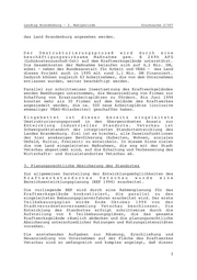 Landtag Brandenburg - 2. Wahlperiode Drucksache 2/307 das Land Brandenburg angesehen werden. Der Umstrukturierungsprozeß wird durch eine beschäftigungswirksame Maßnahme gem. § 249h AFG (Lohnkostenzuschuß-Ost) auf dem Kraftwerksgelände unterstützt. Die Gesamtkosten der Maßnahme belaufen sich auf 4,2 Mio. DM, wobei - neben der Bundesanstalt für Arbeit und VEAG - das Land dieses Projekt auch in 1995 mit rund 1,1 Mio. DM finanziert. Dadurch können zugleich 63 Arbeitnehmer, die von dem Unternehmen entlassen wurden, weiter beschäftigt werden. Parallel zur schrittweisen Inwertsetzung des Kraftwerkgeländes werden Bemühungen unternommen, die Neuansiedlung von Firmen zur Schaffung von Ersatzarbeitsplätzen zu fördern. Bis Juni 1994 konnten mehr als 30 Firmen auf dem Gelände des Kraftwerkes angesiedelt werden, die ca. 500 neue Arbeitsplätze (inclusive ehemaliger VEAG-Mitarbeiter) geschaffen haben. Eingebettet ist dieser bereits eingeleitete Umstrukturierungsprozeß in den übergeordneten Ansatz zur Entwicklung industrieller Standorte. Vetschau ist Schwerpunktstandort der integrierten Standortentwicklung des Landes Brandenburg. Ziel ist es hierbei, alle Daseinsfunktionen der hier ansässigen Bevölkerung (Arbeiten, Wohnen, soziales Umfeld, Kultur, Freizeit) zu entwickeln. In diesem Sinne zielen die vom Land eingeleiteten Maßnahmen, die eng mit der Stadt Vetschau abgestimmt sind, auf die Erhaltung und Verbesserung des Wirtschafts- und Sozialstandortes Vetschau ab. 3. Planungsrechtliche Absicherung des Standortes Zur allgemeinen Darstellung der Entwicklungsmöglichkeiten des Kraftwerkstandortes Vetschau wurde eine Bereichsentwicklungsplanung (BEP 1994) erarbeitet. Die vorliegende BEP wird durch eine Rahmenplanung für das Kraftwerksgelände konkretisiert, die parallel zu den eingeleiteten Bebauungsplanverfahren erarbeitet wird. Der erste Teilbebauungsplan wurde Ende Oktober 1994 von der Stadtverordnetenversammlung Vetschau beschlossen. Die Entwicklung des Standortes erfolgt schrittweise durch die Aufstellung von 6 Teilbebauungsplänen, die das gesamte Kraftwerksgelände räumlich abdecken und die planungsrechtliche Absicherung unterschiedlicher Nutzungen und Nutzungsintensitäten vorsehen. Die anstehenden Aufgaben zur Räumung, Erschließung und Neuansiedlung von Unternehmen auf der Fläche des Kraftwerkes Vetschau sind so umfangreich und komplex angelegt, daß dieser 3