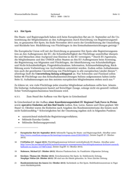Wissenschaftliche Dienste Sachstand Seite 11 WD 2 - 3000 - 156/15 4.3. Hot Spots Die Staats- und Regierungschefs haben sich beim Europäischen Rat am 23. September auf die Un- terstützung der Mitgliedstaaten an den Außengrenzen durch Einrichtung von Registrierungsstel- len, so genannten Hot Spots, bis Ende November 2015 sowie der Gewährleistung der Umsiedlung und Rückkehr bzw. Rückführung von Flüchtlingen in den Erstaufnahmeeinrichtungen geeinigt. 17 Die Europäische Union will mit der Einrichtung so genannter Hot Spots oder Registrierungszen- tren an den Außengrenzen der EU, die Schutzbedürftigkeit der Flüchtlinge unmittelbar überprü- fen und Menschen ohne Asylgrund eine Einreise in die EU verweigern. Durch EU-Agenturen, 18 die Mitgliedstaaten und den UNHCR sollen Staaten an den EU-Außengrenzen beim Screening, der Registrierung von Migranten und Flüchtlingen, der Identifizierung von Schutzbedürftigen und Nicht-Schutzbedürftigen, Fingerabdrucknahme, Information, Schleuserbekämpfung, Rück- führung sowie Vorbereitung von Asylverfahren unterstützt werden. Zudem sollen Aufnahmezen- tren auch der geordneten Umverteilung von Flüchtlingen in alle europäischen Länder dienen , 19 allerdings läuft die Umverteilung bislang schleppend an. Nur Schweden und Finnland sollen bisher 86 Flüchtlinge aus den Erstaufnahmeeinrichtungen Italiens aufgenommen haben (siehe Seite 5). Aufnahmezusagen aus den meisten europäischen Mitgliedstaaten stehen noch aus. 20 Zu klären ist, wie viele Flüchtlinge jeder einzelne Mitgliedstaat aufnehmen sollte bzw. könnte. Die bisherige Aufnahmepraxis basiert auf freiwilliger Zusage, solange nicht ein generell verbind- licher Verteilungsmechanismus beschlossen wird. 4.3.1. Zum Stand des Aufbaus von Hot Spots in Griechenland In Griechenland ist der Aufbau einer Koordinierungseinheit EU Regional Task Force in Piräus sowie operative Einheiten auf den fünf Inseln Lesbos, Kos, Leros, Samos und Chios geplant. Mit Stand 12. Oktober waren die Einheiten nach Angaben des Bundesministeriums des Innern noch nicht funktionsfähig. Schwierigkeiten bei der Umsetzung ergaben sich in folgenden Punkten: 21 unzureichend einheitliche Registrierungsverfahren; fehlende Eurodac-Geräte; fehlendes Bedienungspersonal; 17 Europäischer Rat (23. September 2015). Informelle Tagung der Staats- und Regierungschefs. Abrufbar unter: http://www.consilium.europa.eu/de/meetings/european-council/2015/09/23/, (letzter Zugriff: 27. Oktober 2015). 18 FAZOnline (27. August 2015). Flüchtlingskommissar kritisiert zurückhaltende EU-Staaten. Abrufbar unter: http://www.faz.net/aktuell/politik/ausland/europa/eu-aussengrenzen-fluechtlingskommissar-kritisiert-zurueck- haltende-eu-staaten-13770874.html, (letzter Zugriff: 15. Oktober 2015). 19 Stabenow, Michael (27. Oktober 2015). Mission Flankenschutz. In: Frankfurter Allgemeine Zeitung. 20 Kirchner, Thomas (26. Oktober 2015). Zwischenstation Hot Spots. In: Süddeutsche Zeitung. Nuspliger Niklas (28. Oktober 2015). Oft sind uns die Hände gebunden. In: Neue Zürcher Zeitung. 21 Bundesministerium des Innern (12. Oktober 2015). Sachstände zu Hot Spots, Multifunktionszentrum in Niger sowie Rückkehrpolitik.