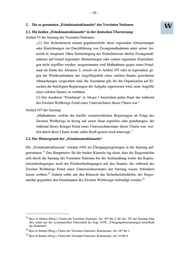 - 10 - 2. Die so genannten „Feindstaatenklauseln“ der Vereinten Nationen 2.1. Die beiden „Feindstaatenklauseln“ in der deutschen Übersetzung Artikel 53 der Satzung der Vereinten Nationen: „(1) Der Sicherheitsrat nimmt gegebenenfalls diese regionalen Abmachungen oder Einrichtungen zur Durchführung von Zwangsmaßnahmen unter seiner Au- torität in Anspruch. Ohne Ermächtigung des Sicherheitsrats dürfen Zwangsmaß- nahmen auf Grund regionaler Abmachungen oder seitens regionaler Einrichtun- gen nicht ergriffen werden; ausgenommen sind Maßnahmen gegen einen Feind- staat im Sinne des Absatzes 2, soweit sie in Artikel 107 oder in regionalen, ge- gen die Wiederaufnahme der Angriffspolitik eines solchen Staates gerichteten Abmachungen vorgesehen sind; die Ausnahme gilt, bis der Organisation auf Er- suchen der beteiligten Regierungen die Aufgabe zugewiesen wird, neue Angriffe eines solchen Staates zu verhüten. (2) Der Ausdruck “Feindstaat“ in Absatz 1 bezeichnet jeden Staat, der während des Zweiten Weltkriegs Feind eines Unterzeichners dieser Charta war.“ Artikel 107 der Satzung: „Maßnahmen, welche die hierfür verantwortlichen Regierungen als Folge des Zweiten Weltkriegs in bezug auf einen Staat ergreifen oder genehmigen, der während dieses Krieges Feind eines Unterzeichnerstaats dieser Charta war, wer- den durch diese Charta weder außer Kraft gesetzt noch untersagt.“ 2.2. Der Hintergrund der „Feindstaatenklauseln“ Die „Feindstaatenklauseln“ wurden 1945 als Übergangsregelungen in die Satzung auf- 31 genommen. Das Hauptmotiv für die beiden Klauseln lag darin, dass die Siegermächte sich durch die Satzung der Vereinten Nationen bei der Aushandlung weder der Kapitu- lationsbedingungen noch der Friedensbedingungen mit den Staaten, die während des Zweiten Weltkriegs Feind eines Unterzeichnerstaates der Satzung waren, behindern 32 lassen wollten. Zudem sollte mit den Klauseln das Sicherheitsbedürfnis der Sieger- 33 mächte gegenüber den Feindstaaten des Zweiten Weltkrieges befriedigt werden. 31 Ress in Simma (Hrsg.), Charta der Vereinten Nationen, Art. 107 Rn 2; für Art. 107 der Satzung folgt dies schon aus der systematischen Überschrift des Kap. XVII: „Übergangsbestimmungen betreffend die Sicherheit“. 32 Ress in Simma (Hrsg.), Charta der Vereinten Nationen: Kommentar, Art. 107 Rn 1. 33 Ress in Simma (Hrsg.), Charta der Vereinten Nationen: Kommentar, Art. 53 Rn 9.