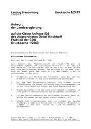 Landtag Brandenburg Drucksache 1/2413 1. Wahlperiode Antwort der Landesregierung auf die Kleine Anfrage 526 des Abgeordneten Detlef Kirchhoff Fraktion der CDU Drucksache 1/2269 Kurzbezeichnung des Wortlautes der Kleinen Anfrage: Klärschlamm Dannenwalde Wortlaut der Kleinen Anfrage Nr. 526: Laut Bericht der "Bild-Zeitung" vom 01.09.1993 soll in Dannenwalde Klärschlamm angeliefert worden sein, bei dem die Grenzwerte an Zink und Quecksilber um 300 % und an Blei um das Achtfache überschritten wurden. Des weiteren sollen Zink, Cad- mium und Arsen durch das Institut für Umweltanalytik Berlin nachgewiesen worden sein. 1. Entspricht die Meldung den Tatsachen, wenn ja, wer hat diese Transporte in das Land Brandenburg genehmigt? 2. Hat das Land Brandenburg Kenntnis vom Einsatz dieses Klärschlammes als Dünger und welche Untersuchungsergebnisse zu den Inhaltsstoffen liegen dem Land Brandenburg vor? 3. Welche Maßnahmen wird das Land unverzüglich einleiten, um eine größere Umweltbelastung des Standortes abzuwenden? 4. Ist dem Land Brandenburg der Verursacher bekannt, wenn ja, welche Maßnahmen werden gegen diesen eingeleitet? 5. Welche Kontrollmechanismen gibt es seitens des Landes Brandenburg, illegale Transporte von schadstoffbelasteten Stoffen in das bzw. durch das Land Brandenburg zu unterbinden? Datum des Originals: 12.10.1993 / Ausgegeben: 26.10.1993 Namens der Landesregierung beantwortet der Minister für Umwelt,