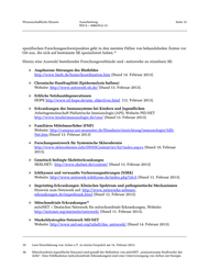 Wissenschaftliche Dienste Ausarbeitung Seite 15 WD 9 – 3000/012-13 spezifischen Forschungsschwerpunktes geht in den meisten Fällen von behandelnden Ärzten vor Ort aus, die sich auf bestimmte SE spezialisiert haben. 35 Hierzu eine Auswahl bestehender Forschungsverbünde und –netzwerke zu einzelnen SE: Angeborene Störungen des Blutbildes http://www.bmfs.de/home/koordination.htm (Stand 14. Februar 2013). Chronische Hautfragilität (Epidermolysis bullosa) Website: http://www.netzwerk-eb.de/ (Stand 13. Februar 2013). Erbliche Netzhautdegenerationen HOPE http://www.rd-hope.de/aim_objectives.html (12. Februar 2013). Erkrankungen des Immunsystems bei Kindern und Jugendlichen Arbeitsgemeinschaft Pädiatrische Immunologie (API), Website PID-NET http://www.kinderimmunologie.de/cms/ (Stand 13. Februar 2013). Familiäres Mittelmeerfieber (FMF) Website: http://campus.uni-muenster.de/fileadmin/einrichtung/immunologie/AID- Net.htm (Stand 13. Februar 2013) Forschungsnetzwerk für Systemische Sklerodermie http://www.sklerodermie.info/DNSSContent/m1/k2/index.aspxx (Stand 19. Februar 2013). Genetisch bedingte Skeletterkrankungen SKELNET: http://www.skelnet.de/content/ (Stand 13. Februar 2013) Ichthyosen und verwandte Verhornungsstörungen (NIRK) Website: http://www.netzwerk-ichthyose.de/index.php?id=5 (Stand 11. Februar 2013). Imprinting-Erkrankungen: Klinisches Spektrum und pathogenetische Mechanismen Hinweis zum Netzwerk auf: http://www.netzwerke-seltener- erkrankungen.de/imperkrank.html (Stand 12. Februar 2013). Mitochondriale Erkrankungen 36 mitoNET – Deutsches Netzwerk für mitochondriale Erkrankungen, Website: http://mitonet.org/startseite/netzwerk/ (Stand 11. Februar 2013). Muskeldystrophie-Netzwerk MD-NET Website: http://www.md-net.org/inhalt/das_netzwerk/ (Stand 14. Februar 2013). 35 Laut Einschätzung von Achse e.V. in einem Gespräch am 14. Februar 2013. 36 Mitochondrien (spezifische Enzyme) sind gemäß der Definition von mitoNET „semiautonome Kraftwerke der Zelle“. Eine Fehlfunktion (mitochondriale Erkrankungen) sind eine Unterversorgung von Zellen mit Energie.
