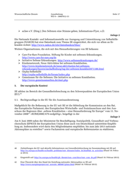 Wissenschaftliche Dienste Ausarbeitung Seite 17 WD 9 – 3000/012-13 achse e.V. (Hrsg.), Den Seltenen eine Stimme geben, Informations-Flyer, o.D. Anlage 2 Die Nationale Kontakt- und Informationsstelle zur Anregung und Unterstützung von Selbsthilfe- gruppen (NAKOS) hat eine Datenbank zum Thema SE eingerichtet, die sich vor allem an Er- krankte richtet: http://www.nakos.de/site/datenbanken/blau/ Weitere Organisationen, die sich mit den Herausforderungen von SE befassen: Care-For-Rare Foundation. Stiftung für Kinder mit seltenen Erkrankungen. http://www.care-for-rare.org/de Initiative Seltene Erkrankungen. http://www.selteneerkrankungen.de/ Kindernetzwerk, Neue Aktivitäten bei seltenen Krankheiten, http://www.kindernetzwerk.de/neue-aktivitaeten-bei-seltenen- erkrankungen/bayern/aschaffenburg/tag-der-seltenen-krankheit071188.html Orpha-Selbsthilfe http://orpha-selbsthilfe.de/forum/index.php Gemeinsam für die Seltenen. Die Initiative zu seltenen Krankheiten. http://www.gemeinsamselten.de/start.php 5. Der europäische Kontext SE zählen im Bereich der Gesundheitsforschung zu den Schwerpunkten der Europäischen Union (EU).40 5.1. Rechtgrundlage in der EU für die Auseinandersetzung Maßgeblich für die Befassung in der EU mit SE ist die Mitteilung der Kommission an den Rat, das Europäische Parlament, den Europäischen Wirtschafts- und Sozialausschuss und den Aus- schuss der Regionen über „seltene Krankheiten – eine Herausforderung für Europa“ vom 11. No- vember 2008 <KOM(2008) 679 endgültig>, beigefügt in der 41 Anlage 3 Am 9. Juni 2009 nahm der Ministerrat für Beschäftigung, Sozialpolitik, Gesundheit und Verbrau- cherschutz (EPSCO) der Europäischen Union diese auch von Deutschland unterstütze Empfeh- lung an. Insbesondere wird darin den Mitgliedstaaten empfohlen, bis zum Jahr 2013 nationale Aktionspläne zu erstellen sowie Fachzentren und europäische Referenznetze zu etablieren. 42 40 Zielstellungen der EU und aktuelle Informationen zur Gesundheitsforschung im Zusammenhang mit SE auf: http://ec.europa.eu/health-eu/health_problems/rare_diseases/index_de.htm#tab_eu_activities (Stand 19. Febru- ar 2013). 41 Eingestellt auf: http://ec.europa.eu/health/ph_threats/non_com/docs/rare_com_de.pdf (Stand 19. Februar 2013). 42 Eine Übersicht über den Stand der Erstellung nationaler Aktionspläne zu SE auf: http://www.europlanproject.eu/_newsite_986987/plans.html (Stand 18. Februar 2013).
