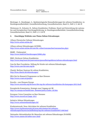 Wissenschaftliche Dienste Ausarbeitung Seite 21 WD 9 – 3000/012-13 Rückinger, S., Boneberger, A., Epidemiologische Herausforderungen bei seltenen Krankheiten, in: Bundesgesundheitsblatt, Gesundheitsforschung, Gesundheitsschutz, Band 51, Heft 5, S. 483 ff. Wetterauer, B., Schuster, R., Seltene Krankheiten. Probleme, Stand und Entwicklung der nationa- len und Europäischen Forschungsförderung, in: Bundesgesundheitsblatt, Gesundheitsforschung, Gesundheitsschutz, Band 51, Heft 5, S. 519 ff. 9. Einschlägige Weblinks zum Thema Seltene Erkrankungen Allianz Chronischer Seltener Erkrankungen http://www.achse-online.de/ Allianz seltener Erkrankungen (ACHSE), http://www.achse-online.de/cms/die_achse/warumachse/warumachse.phpv BMBF, Fördermittel http://www.bmbf.de/foerderungen/20962.php BMG, Stichwort Seltene Krankheiten http://www.bmg.bund.de/praevention/gesundheitsgefahren/seltene-erkrankungen.html Care-for Rare Foundation. Stiftung für Kinder mit seltenen Erkrankungen. http://www.care-for-rare.org/de Charité, Berliner Zentrum für seltene Krankheiten, http://bcse.charite.de/erkrankungen/ ERA-Net for Research Programmes on Rare Diseases http://www.e-rare.eu/project Eurodis – rare Diseases Europe http://www.eurordis.org/de/news/der-tag-der-seltenen-krankheiten-die-kampagne-2013-lauft Europäische Kommission, Strategie zum Umgang mit SK http://ec.europa.eu/health/rare_diseases/policy/index_de.htm European Union Committee on Rare Deseases http://www.eucerd.eu/?page_id=2 Initiative Seltene Erkrankungen http://www.selteneerkrankungen.de/ Kindernetzwerk, Neue Aktivitäten bei seltenen Krankheiten http://www.kindernetzwerk.de/neue-aktivitaeten-bei-seltenen- erkrankungen/bayern/aschaffenburg/tag-der-seltenen-krankheit071188.html Nationales Aktionsbündnis für Menschen mit seltenen Erkrankungen (NAMSE) http://www.namse.de/ueber-uns+.html