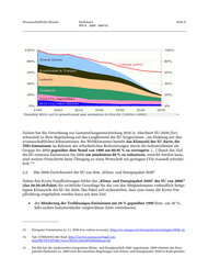 Wissenschaftliche Dienste Sachstand Seite 7 WD 8 - 3000 - 009/18 Periode vom 1.1.2021-31.12.2030) ihre Treibhausgasemissionen um mindestens 40% gegenüber 1990 zu reduzieren. 8 Das Pariser Übereinkommen schreibt den Vertragsstaaten keine konkreten Maßnahmen zur Errei- chung der Vertragsziele vor. Es verpflichtet sie vielmehr dazu, selbst festgelegte, sich ständig stei- gernde Beiträge zur Erreichung der Vertragsziele zu leisten. Insoweit steht den Vertragsparteien ein breiter Spielraum zu, wobei die ‚entwickelten‘ Länder absolute gesamtwirtschaftliche Emissi- onsreduktionsziele formulieren sollen. Das Pariser Übereinkommen sieht zwar Regeln vor, die der Prüfung der Verpflichtungen der Vertragsstaaten dienen, enthält jedoch keine entsprechen- den Durchsetzungsmechanismen. Darüber hinaus besteht für jede Vertragspartei das Recht, von dem Klimaschutz-Übereinkom- mens von Paris gemäß Art. 28 Abs. 1 nach Ablauf von drei Jahren ab dem Zeitpunkt, an dem das Übereinkommen für die betreffende Vertragspartei in Kraft getreten ist, durch eine an den VN- Generalsekretär gerichtete schriftliche Notifikation zurückzutreten (Art. 28). 9 2. EU-Klimaziel 2050 und Zwischenziele 2020 und 2030 Die EU hat sich als Ziel gesetzt, bis 2050 ihre jährlichen Treibhausgas (THG)-Emissionen im Ver- gleich zu 1990 um 80 bis 95% zu senken. Als rechtlich verbindliche Zwischenziele sind gegen- über 1990 Emissionsreduktionen von 20% bis 2020 (dabei 21% Emissionsminderungen in den Sektoren Energie und Industrie und 10% in den übrigen Bereichen gegenüber 2005) und mindes- tens 40% bis 2030 (43% über die vom Emissionshandelssystem ETS erfassten Sektoren und 30% der nicht darunter fallenden Bereiche gegenüber 2005) vorgesehen. Für Deutschland gelten dabei nationale zu erreichende Klimaziele für die Sektoren, die nicht unter den ETS fallen: für 2020 ist eine Emissionsminderung von 14% und für 2030 eine um 38% gegenüber 2005 zu erreichen. Be- züglich des nachzuweisenden Anteils an den erneuerbaren Energien am Gesamtenergieverbrauch beträgt das nationale Ziel 18%, die nationalen Energieeffizienzziele sind selbständig festzulegen (Deutschland sieht die Senkung des Primärenergieverbrauchs um 20% gegenüber 2008 vor) und unterliegen verbindlichen Grundsätzen. 8 Vgl. Intended Nationally Determined Contribution of the EU and its Member States: http://www4.un- fccc.int/ndcregistry/PublishedDocuments/Germany%20First/LV-03-06-EU%20INDC.pdf; 6.3.2015. Zur Erläuter- ung und Einordnung des Ziels heißt es: “It is in line with the EU objective, in the context of necessary reduc- tions according to the IPCC by developed countries as a group, to reduce its emissions by 80-95% by 2050 com- pared to 1990. Furthermore, it is consistent with the need for at least halving global emissions by 2050 com- pared to 1990. The EU and its Member States have already reduced their emissions by around 19% on 1990 lev- els while GDP has grown by more than 44% over the same period. As a result, average per capita emissions across the EU and its Member States have fallen from 12 tonnes CO2-eq. in 1990 to 9 tonnes CO2-eq. in 2012 and are projected to fall to around 6 tonnes CO2-eq. in 2030. The emissions in the EU and its Member States peaked in 1979.” (3) 9 Vgl. zu den letzten zwei Absätzen auch Deutscher Bundestag (2017). Wissenschaftliche Dienste Sachstand WD 2 - 3000 - 055/17. Rechtliche Modalitäten und Folgen eines Austritts der USA aus dem Pariser Klimaschutz-Über- einkommen vom 12. Dezember 2015: https://www.bundes- tag.de/blob/513892/fc32a476c31c5962458a4645a691244c/wd-2-055-17-pdf-data.pdf