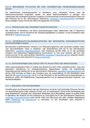 10.1.3. BESONDERE PFLICHTEN BEI DER VERARBEITUNG PERSONENBEZOGENER DATEN Die federführende Organisationseinheit im Ministerium muss nachweisen können, dass die Datenschutzvorschriften eingehalten werden. Um dieser Rechenschaftspflicht zu genügen, sind insbesondere alle nachfolgend genannten Vorgänge im Zusammenhang mit personenbezogenen Daten und jede Änderung der für den administrativen Datenschutz zuständigen Organisationseinheit anzuzeigen. Dieses beteiligt in jedem Fall die*den DSB ordnungsgemäß und frühzeitig. 10.1.4. VERZEICHNIS DER VERARBEITUNGSTÄTIGKEITEN Alle Verfahren im Ministerium, bei denen personenbezogene Daten (elektronisch oder in Papierform) verarbeitet werden, sind im Verzeichnis der Verarbeitungstätigkeiten zu erfassen. Zu den Einzelheiten siehe Abschnitt VI Datenschutzkonzept. 10.1.5. DATENSCHUTZ-FOLGEABSCHÄTZUNG BEI BESONDERS RISIKOBEHAFTETEN DATENVERARBEITUNGEN Bei besonders eingriffsintensiven Verfahren (z.B. Überwachungstechnik) oder besonders sensiblen Daten (z.B. Gesundheitsdaten, Daten zu Disziplinar- oder Strafverfahren) prüft die für den administrativen Datenschutz zuständige Organisationseinheit unter Einbindung der*des DSB, ob für das gemeldete Verfahren eine Datenschutz-Folgeabschätzung durchzuführen ist. Das neue Verfahren darf erst nach Zustimmung der für den administrativen Datenschutz zuständigen Organisationseinheit eingeführt werden. Zu den Einzelheiten siehe Abschnitt VII Datenschutzkonzept. 10.1.6. DATENVERARBEITUNG DURCH DRITTE IM AUFTRAG DES MINISTERIUMS Sollen personenbezogene Daten im Auftrag des Ministeriums durch Dritte verarbeitet werden, muss eine gesonderte Vereinbarung zur Auftragsverarbeitung abgeschlossen werden. Die federführende Organisationseinheit beteiligt die für den administrativen Datenschutz zuständige Organisationseinheit und die*den DSB frühzeitig vor Beginn des Vorhabens bzw. der Ausschreibung. Zu den Einzelheiten siehe Abschnitt VIII Datenschutzkonzept und Nr. 2.4.2 der Richtlinien für die Durchführung von Beschaffungen im Ministerium (LINK). Die federführende Organisationseinheit hat die datenschutzrechtlich Aufsichts- und Rechenschaftspflicht. 10.1.7. MELDUNG VON DATENPANNEN Verstöße gegen die Datensicherheit oder den Datenschutz, bei denen nicht berechtigte Personen Kenntnis von personenbezogenen Daten erlangen könnten (z.B. ein Hackerangriff, Verlust eines Dienstlaptops oder eines Mobiltelefons, bewusste oder unbewusste Weitergabe durch Beschäftigte) bergen ein großes Risiko für Betroffene. Bei Verdacht auf eine Datenpanne ist unverzüglich die für den administrativen Datenschutz zuständige Organisationseinheit sowie die*der DSB unter Benutzung des dafür erstellten Meldebogens [siehe Meldebogen bei Datenpannen] zu informieren. Zu den Einzelheiten siehe Abschnitt X Datenschutzkonzept. 52