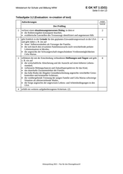 Ministerium für Schule und Bildung NRW E GK NT 1 (GG) Seite 4 von 13 Teilaufgabe 3.1 (Evaluation: comment) Anforderungen maximal erreichbare Punktzahl Der Prüfling 1 greift die im Zitat erklärte Absicht einer auf den alleinigen Nutzen der USA ausge- 6 richteten Zuwanderungspolitik unter funktionalem Rückgriff auf im Unterricht erworbenes Wissen zu sozialen Realitäten in den USA sowie zum Amerikanischen Traum kritisch-wertend auf und geht z. B. ein auf • historisch verankerte Ideale und Wertvorstellungen sowie das (Selbst-)Bild der USA als Einwanderungsland, • das Spannungsfeld zwischen der gezielten Anwerbung der Bildungselite und dem hohen Bedarf an billigen Arbeitskräften, • das strikte Vorgehen gegen illegale Einwanderinnen und Einwanderer der Trump-Regierung, • die in den letzten Jahren verstärkt nationalistisch ausgerichtete Politik der Vereinigten Staaten. 2 erläutert kritisch-wertend und unter funktionalem Rückgriff auf im Unterricht 6 erworbenes Wissen die Bedeutung einer gezielten nationalen Einwanderungs- politik in einer globalisierten Welt und verweist dabei z. B. auf • den zunehmenden Bedarf an hochqualifizierten Arbeitskräften in Industrienationen sowie den daraus resultierenden globalen Wettbewerb um diese, • die Auswirkungen der gezielten Abwerbung qualifizierter Fachkräfte für die Herkunftsländer, • die mit unkontrollierter Einwanderung verbundenen gesellschaftlichen und wirtschaftlichen Gefahren, • die Gefahr der Instrumentalisierung der Einwanderungsthematik angesichts zunehmender nationalistischer und populistischer Tendenzen weltweit. 3 kommt auf Grundlage seiner Argumentation zu einem begründeten und nachvoll- 2 ziehbaren Fazit. 4 erfüllt ein weiteres aufgabenbezogenes Kriterium. (2) Abiturprüfung 2021 – Nur für den Dienstgebrauch!