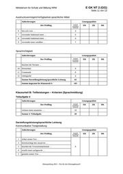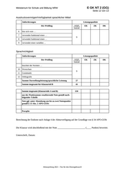 Ministerium für Schule und Bildung NRW E GK NT 2 (GG) Seite 11 von 13 Ausdrucksvermögen/Verfügbarkeit sprachlicher Mittel Anforderungen Lösungsqualität Der Prüfling maximal erreichbare EK ZK DK Punktzahl 6 löst sich vom … 4 7 verwendet funktional einen … 6 8 verwendet funktional einen … 4 9 verwendet einen variablen … 7 Sprachrichtigkeit Anforderungen Lösungsqualität Der Prüfling maximal erreichbare EK ZK DK Punktzahl beachtet die Normen … 10 Wortschatz 9 11 Grammatik 8 12 Orthografie 4 Summe Darstellungsleistung/sprachliche Leistung 63 Summe insgesamt für Klausurteil A 105 Klausurteil B: Teilleistungen – Kriterien (Sprachmittlung) Teilaufgabe 4 Anforderungen Lösungsqualität Der Prüfling maximal erreichbare EK ZK DK Punktzahl verfasst einen situations- … 18 Summe 4. Teilaufgabe 18 Darstellungsleistung/sprachliche Leistung Kommunikative Textgestaltung Anforderungen Lösungsqualität Der Prüfling maximal erreichbare EK ZK DK Punktzahl 1 richtet seinen Text … 2 berücksichtigt den situativen … 3 beachtet die Textsortenmerkmale … 9 4 erstellt einen sachgerecht … 5 gestaltet seinen Text … Abiturprüfung 2021 – Nur für den Dienstgebrauch!