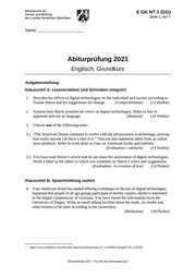 E GK NT 3 (GG) Seite 1 von 7 Name: _______________________ Abiturprüfung 2021 Englisch, Grundkurs Aufgabenstellung: Klausurteil A: Leseverstehen und Schreiben integriert 1. Describe the effects of digital technologies on the individual and society according to Tristan Harris and his suggestions for change. (Comprehension) (12 Punkte) 2. Analyse how Harris presents his views on digital technologies. Refer to line of argument and use of language. (Analysis) (16 Punkte) 3. Choose one of the following tasks: 3.1 “The American Dream continues to evolve with the advancement in technology, proving that really anyone can have a shot at it.” Discuss this statement taken from an online 1 news platform. Refer to work done in class on American myths and realities. (Evaluation: comment) (14 Punkte) 3.2 You have read Harris’s article and do not share his assessment of digital technologies. Write a letter to the editor in which you comment on Harris’s views and suggestions. (Evaluation: re-creation of text) (14 Punkte) Klausurteil B: Sprachmittlung isoliert 4. Your American friend has started offering workshops on the use of digital technologies. Surprised that people of all age groups participate in her/his courses, she/he is interested in the digital competences of Germans. You have found the information from the University of Siegen. Write an email telling her/him about the study, its results and what remains to be done according to the researchers. (Mediation) (18 Punkte) 1 https://www.huffpost.com/entry/the-american-dream-isnt-d_b_11250032 (Zugriff: 05.12.2020) Abiturprüfung 2021 – Nur für den Dienstgebrauch!