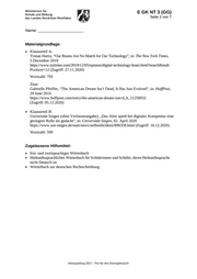 E GK NT 3 (GG) Seite 2 von 7 Name: _______________________ Materialgrundlage: • Klausurteil A: Tristan Harris, “Our Brains Are No Match for Our Technology”, in: The New York Times, 5 December 2019 https://www.nytimes.com/2019/12/05/opinion/digital-technology-brain.html?searchResult Position=12 (Zugriff: 27.11.2020) Wortzahl: 793 Zitat: Gabrielle Pfeiffer, “The American Dream Isn’t Dead, It Has Just Evolved“, in: HuffPost, 29 June 2016 https://www.huffpost.com/entry/the-american-dream-isnt-d_b_11250032 (Zugriff: 05.12.2020) • Klausurteil B: Universität Siegen (ohne Verfasserangabe), „Das Alter spielt bei digitaler Kompetenz eine geringere Rolle als gedacht“, in: Universität Siegen, 02. April 2020 https://www.uni-siegen.de/start/news/oeffentlichkeit/896358.html (Zugriff: 16.12.2020) Wortzahl: 599 Zugelassene Hilfsmittel: • Ein- und zweisprachiges Wörterbuch • Herkunftssprachliches Wörterbuch für Schülerinnen und Schüler, deren Herkunftssprache nicht Deutsch ist • Wörterbuch zur deutschen Rechtschreibung Abiturprüfung 2021 – Nur für den Dienstgebrauch!