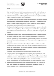 E GK NT 3 (GG) Seite 4 von 7 Name: _______________________ [O]ur Paleolithic brains aren’t built for omniscient awareness of the world’s suffering. Our online news feeds aggregate all of the world’s pain and cruelty, dragging our brains into a 30 kind of learned helplessness. Technology that provides us with near-complete knowledge without a commensurate level of agency isn’t humane. Our Paleolithic brains also aren’t wired for truth-seeking. Information that confirms our beliefs makes us feel good; information that challenges our beliefs doesn’t. Tech giants that give us more of what we click on are intrinsically divisive. Decades after splitting the atom, 35 technology has split society into different ideological universes. Simply put, technology has outmatched our brains, diminishing our capacity to address the world’s most pressing challenges. The advertising business model built on exploiting this mismatch has created the attention economy. In return, we get the “free” downgrading of humanity. 40 This leaves us profoundly unsafe. With two billion humans trapped in these environments, the attention economy has turned us into a civilization maladapted for its own survival. Here’s the good news: We are the only species self-aware enough to identify this mismatch between our brains and the technology we use. Which means we have the power to reverse these trends. 45 The question is whether we can rise to the challenge, whether we can look deep within ourselves and use that wisdom to create a new, radically more humane technology. “Know thyself,” the ancients exhorted. We must bring our godlike technology back into alignment with an honest understanding of our limits. This may all sound pretty abstract, but there are concrete actions we can take. 50 First, policymakers can create a special tax for tech giants – a “downgrading tax” – that would make their business models, based on extracting and exhausting our attention spans, prohibitively expensive, while redistributing wealth to journalism, public education and the creation of new platforms that privilege human values and service to society. Second, instead of joining free social media platforms that benefit from turning us into 55 addicted, narcissistic extremists, we could agree to pay subscription fees to services that shun “likes” for features that empower our lives offscreen, making these services, in essence, fiduciaries acting in the best interests of humanity. Abiturprüfung 2021 – Nur für den Dienstgebrauch!