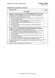 Ministerium für Schule und Bildung NRW E GK NT 1 (W1) Seite 4 von 13 Teilaufgabe 3.1 (Evaluation: comment) Anforderungen maximal erreichbare Punktzahl Der Prüfling 1 greift die im Zitat erklärte Absicht einer auf den alleinigen Nutzen der USA ausge- 6 richteten Zuwanderungspolitik unter funktionalem Rückgriff auf im Unterricht erworbenes Wissen zu sozialen Realitäten in den USA sowie zum Amerikanischen Traum kritisch-wertend auf und geht z. B. ein auf • historisch verankerte Ideale und Wertvorstellungen sowie das (Selbst-)Bild der USA als Einwanderungsland, • das Spannungsfeld zwischen der gezielten Anwerbung der Bildungselite und dem hohen Bedarf an billigen Arbeitskräften, • das strikte Vorgehen gegen illegale Einwanderinnen und Einwanderer der Trump-Regierung, • die in den letzten Jahren verstärkt nationalistisch ausgerichtete Politik der Vereinigten Staaten. 2 erläutert kritisch-wertend und unter funktionalem Rückgriff auf im Unterricht 6 erworbenes Wissen die Bedeutung einer gezielten nationalen Einwanderungs- politik in einer globalisierten Welt und verweist dabei z. B. auf • den zunehmenden Bedarf an hochqualifizierten Arbeitskräften in Industrienationen sowie den daraus resultierenden globalen Wettbewerb um diese, • die Auswirkungen der gezielten Abwerbung qualifizierter Fachkräfte für die Herkunftsländer, • die mit unkontrollierter Einwanderung verbundenen gesellschaftlichen und wirtschaftlichen Gefahren, • die Gefahr der Instrumentalisierung der Einwanderungsthematik angesichts zunehmender nationalistischer und populistischer Tendenzen weltweit. 3 kommt auf Grundlage seiner Argumentation zu einem begründeten und nachvoll- 2 ziehbaren Fazit. 4 erfüllt ein weiteres aufgabenbezogenes Kriterium. (2) Abiturprüfung 2021 – Nur für den Dienstgebrauch!