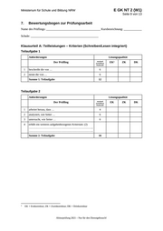 Ministerium für Schule und Bildung NRW E GK NT 2 (W1) Seite 9 von 13 7. Bewertungsbogen zur Prüfungsarbeit Name des Prüflings: ____________________________________ Kursbezeichnung: ____________ Schule: _____________________________________________ Klausurteil A: Teilleistungen – Kriterien (Schreiben/Lesen integriert) Teilaufgabe 1 Anforderungen Lösungsqualität Der Prüfling maximal erreichbare EK2 ZK DK Punktzahl 1 beschreibt die von … 6 2 nennt die von … 6 Summe 1. Teilaufgabe 12 Teilaufgabe 2 Anforderungen Lösungsqualität Der Prüfling maximal erreichbare EK ZK DK Punktzahl 1 arbeitet heraus, dass … 4 2 analysiert, wie Setter … 6 3 untersucht, wie Setter … 6 4 erfüllt ein weiteres aufgabenbezogenes Kriterium: (2) …………………………………………………………….. …………………………………………………………….. Summe 2. Teilaufgabe 16 2 EK = Erstkorrektur; ZK = Zweitkorrektur; DK = Drittkorrektur Abiturprüfung 2021 – Nur für den Dienstgebrauch!