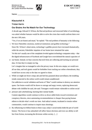 E GK NT 3 (W1) Seite 3 von 7 Name: _______________________ Klausurteil A Tristan Harris Our Brains Are No Match for Our Technology A decade ago, Edward O. Wilson, the Harvard professor and renowned father of sociobiology, was asked whether humans would be able to solve the crises that would confront them over the next 100 years. “Yes, if we are honest and smart,” he replied. “The real problem of humanity is the following: 5 We have Paleolithic emotions, medieval institutions and godlike technology.” Since Mr. Wilson’s observation, technology’s godlike powers have increased dramatically, while the ancient, Paleolithic impulses of our brains have remained the same. Yet this isn’t usually one of the complaints leveled against technology companies today – that the digital infrastructures of Facebook and Google have overwhelmed the natural capacities of 10 our brains. Instead, we hear concerns that tech firms are collecting and tracking our personal data. Or that they’re simply too big. Let’s imagine that we managed to solve the privacy issue. In this new utopia, we would own all our data, and tech giants would be forbidden from tracking our online whereabouts; they would have access only to the data we agreed to share. 15 While we might see fewer creepy ads and feel less paranoid about surveillance, the troubling trends connected to the online world would remain unaddressed. Our addiction to social validation and bursts of “likes” would continue to destroy our attention spans. Our brains would still be drawn to outrage and angry tweets, replacing democratic debate with childlike he-said, she-said. Teenagers would remain vulnerable to online social 20 pressure and cyberbullying, harming their mental health. Content algorithms would continue to drive us down rabbit holes toward extremism and conspiracy theories, since automating recommendations is cheaper than paying human editors to decide what’s worth our time. And radical content, incubated in insular online communities, would continue to inspire mass shootings. 25 By influencing two billion brains in these ways, today’s social media holds the pen of world history: The forces it has unleashed will affect future elections and even our ability to tell fact from fiction, increasing the divisions within society. […] Abiturprüfung 2021 – Nur für den Dienstgebrauch!