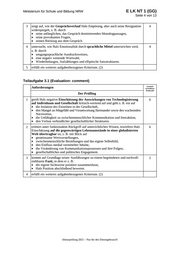 Ministerium für Schule und Bildung NRW E LK NT 1 (GG) Seite 11 von 13 Sprachrichtigkeit Anforderungen Lösungsqualität Der Prüfling maximal erreichbare EK ZK DK Punktzahl beachtet die Normen … 10 Wortschatz 9 11 Grammatik 8 12 Orthografie 4 Summe Darstellungsleistung/sprachliche Leistung 63 Summe insgesamt für Klausurteil A 105 Klausurteil B: Teilleistungen – Kriterien (Sprachmittlung) Teilaufgabe 4 Anforderungen Lösungsqualität Der Prüfling maximal erreichbare EK ZK DK Punktzahl verfasst eine situations- … 18 Summe 4. Teilaufgabe 18 Darstellungsleistung/sprachliche Leistung Kommunikative Textgestaltung Anforderungen Lösungsqualität Der Prüfling maximal erreichbare EK ZK DK Punktzahl 1 richtet seinen Text … 2 berücksichtigt den situativen … 3 beachtet die Textsortenmerkmale … 9 4 erstellt einen sachgerecht … 5 gestaltet seinen Text … Abiturprüfung 2021 – Nur für den Dienstgebrauch!