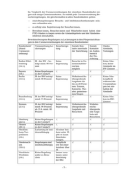 Im Vergleich der Coronaverordnungen der einzelnen Bundesländer zei- gen sich einige Gemeinsamkeiten. So enthält jede Coronaverordnung Be- sucherregelungen, die gleichermaßen in allen Bundesländern gelten: — einrichtungsbezogene Besuchs- und Infektionsschutzkonzepte müs- sen vorhanden sein, — es erfolgt eine Registrierung der Besucher:innen, — Bewohner:innen, Besucher:innen und Mitarbeiter:innen haben eine FFP2-Maske zu tragen sowie die Abstandsgebote und die Händedes- infektion einzuhalten. Bewohnerbezogene Regelungen zu Lockerungen in den Pflegeeinrichtun- gen in den Coronaverordnungen der einzelnen Bundesländer: Bundesland/ Voraussetzung Lo- Besuchsrege- Soziale Kon- Soziale Maske, (Stand ckerungen lung takte innerhalb Kontakte Abstände, Coronaver- der Einrichtung im Außen- Testungen ordnung) bereich der Ein- richtung Baden-Würt- IR : der BW :: be- Keine Besuche in Ge- Keine Mas- temberg trägt mind. 90 Pro- Begrenzung meinschaftsbe- ken, keine (14.5.) zent reichen Abstände im möglich BW-Zimmer Bayern Keine Regelungen ./. ./. ./. ./. (5.6.) in der CoronaV. Berlin IR der BW beträgt Keine Wohnbereichs- ./. Keine Mas- (15.6.) mind. 90 Prozent Begrenzung übergreifende kenpflicht Angebote für während der bis zu 20 Perso- Veranstaltun- nen: Tanzen, gen bei ein- Konzerte, The- halten der ater, gemeinsa- Abstände mes Singen Brandenburg IR der BW beträgt Keine ./. ./. Keine Mas- (15.6.) mind. 75 Prozent Begrenzung ken im BW- Zimmer Bremen IR der BW beträgt Keine Wohnbereichs- Wohnbe- (21.6.) mind. 90 Prozent, Begrenzung übergreifende reichs- ab 21.6. mind. 80 Angebote mit übergreife Prozent Besuchern nde Ange- bote mit Besuchern Hamburg Keine Regelungen ./. ./. ./. ./. (22.6.) in der CoronaV Hessen Keine Regelungen ./. ./. ./. ./. (29.5.) in der CoronaV Mecklen- Lockerung ist inzi- Ab einer Inzi- ./. ./. ./. burg-Vor- denzabhängig denz unter 35 pommern gibt es kaum (5.6.) Einschrän- kungen. Niedersach- Regelungen sind Testpflicht ./. ./. ./. sen inzidenzabhängig erst bei einer (18.6.) Inzidenz über 35 Nordrhein- Keine Regelung Immer zuzu- ./. ./. ./. Westfalen außer zu Besu- lassen unter (5.6.) chen Beachtung der RKI- –7–