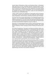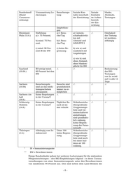 Bundesland/ Voraussetzung Lo- Besuchsrege- Soziale Kon- Soziale Maske, (Stand ckerungen lung takte innerhalb Kontakte Abstände, Coronaver- der Einrichtung im Außen- Testungen ordnung) bereich der Ein- richtung Empfehlun- gen Rheinland- Staffelung: a) 2 Besu- a) Gemein- ./. Häufigkeit Pfalz (15.6.) a) < 75 Prozent, che/Tag schaftsaktivitä- der Testung ten mit ist inzidenz- b) mind. 75 Pro- b) 4 Besu- Abstand und abhängig zent, che/Tag MNS/FFP 2 c) mind. 90 Pro- c) keine Be- b) wie a) und zent IR der BW grenzung zusätzlich mit Angehörigen c) wie b) und ohne Abstand, ohne Masken- pflicht für BW Saarland IR beträgt mind. ./. ./. ./. Reduzierung (10.06.) 90 Prozent bei den der BW- BW Testungen von 2x wchtl. auf 1x alle 14 Tage Sachsen Besuchsregeln Besuche sind ./. ./. ./. (10.06) sind an das Infek- grundsätzlich tionsgeschehen immer zu er- anzupassen möglichen Sachsen-An- Keine Regelungen ./. ./. ./. ./. halt in der CoronaV (16.6.) Schleswig- Keine Regelungen Täglicher Be- Wohnbereichs- ./. ./. Holstein in der CoronaV such ist im- übergreifende (14.6.) mer erlaubt Gruppenange- bote und Ge- meinschaftsver anstaltungen sind grundsätz- lich zulässig, keine Begren- zung der Perso- nenzahl Thüringen Abhängig vom In- Unter 100 Wohnbereichs- ./. ./. (1.6.) zidenzwert keine Begren- übergreifende zung Gruppenange- bote sind auch bei einer Inzi- denz ab 100 zulässig. * IR = Immunisierungsrate ** BW = Bewohner:innen Einige Bundesländer gehen bei weiteren Lockerungen für die stationären Pflegeeinrichtungen – den RKI-Empfehlungen folgend – in ihren Corona- verordnungen von einer Immunisierungsrate unter den Bewohner:innen von mindestens 90 Prozent aus. Dies sind neben dem Land Bremen die –8–
