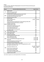 Anlage 1 zur Kleinen Anfrage „Öffentliche Auftragsvergabe als Instrument für Ressourcenschonung und Kreislaufwirtschaft fördern“ Ressort Bremische (Mehrheits)Gesellschaften angeschlossen BREBAU GmbH nein SF Bremer Toto und Lotto GmbH nein Governikus GmbH & Co. KG nein Ambulanz Bremen GmbH/Fachärztezetrum Hanse GmbH nein Gesundheit Nord gGmbH Klinikverbund Bremen ja SGFV Gesundheit Nord Dienstleistungen GmbH nein Rehazentrum Bremen GmbH nein botanika GmbH nein Bremer Straßenbahn AG ja (OCI‐Verbindung) BREPARK GmbH nein Consult Team Bremen Gesellschaft für Verkehrsplanung und Bau mbH nein GEWOBA Aktiengesellschaft Wohnen und Bauen nein GEWOBA Energie GmbH nein SKUMS GEWOBA Wohnen GmbH nein Gesellschaft für Stadtentwicklung mbH nein Grundstücksentwicklung Klinikum nein Bremen‐Mitte GmbH & Co. KG Hanseatische Naturentwicklung GmbH nein WeserBahn GmbH nein Bremer Philharmoniker GmbH nein SfK Theater Bremen GmbH nein Bremer Bäder GmbH ja SJIS Werkstatt Nord gGmbH nein Ausbildungsgesellschaft Bremen mbH nein Bremer Aufbau‐Bank GmbH ja Glocke Veranstaltungs‐GmbH ja, über WFB SWAE H. A. G. E Grundstücksverwaltungsgesellschaft mbH ja, über WFB M3B GmbH ja, über WFB Universum Management Gesellschaft mbH ja Wirtschaftsförderung Bremen GmbH ja AHS Bremen Aviation Handling Services GmbH nein BLG BREMER LAGERHAUS‐GESELL‐SCHAFT Aktiengesellschaft von 1877 nein BLG Logistics Group AG & Co. KG nein nein, aber Nutzung der bremenports GmbH & Co. KG Rahmenverträge SWH Bremen Airport Handling GmbH nein Bremen Airport Service GmbH nein Fähren Bremen‐Stedingen GmbH nein Fischereihafen‐Betriebsgesellschaft mbH ja Flughafen Bremen GmbH nein Stand: 05/2021. Dargestellt sind nur Mehrheitsgesellschaften mit Personalkörper 1/2