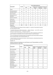 Davon Phänomenbereich Themenfeld1 Gesamt religiöse Ide- ausländische nicht zuzu- rechts links ologie2 Ideologie ordnen Ohne Kategorie 8 0 0 0 0 8 Ökologie/Industrie/ 3 0 3 0 0 0 Wirtschaft Politischer Kalender 0 0 0 0 0 0 Proliferation 0 0 0 0 0 0 Reichsbürger/ 2 0 0 0 0 2 Selbstverwalter Sozialpolitik 3 0 3 0 0 0 3 Insgesamt 464 142 230 10 25 57 Anmerkungen: 1 In den verschiedenen Berichtsjahren können mögliche, zu vergebene Themenfelder hinzukom- men oder gestrichen werden. 2 Gesonderte Erfassung des Phänomenbereiches − religiöse Ideologie − erst ab 2017, zuvor Be- standteil des Phänomenbereiches − ausländische Ideologie −. 3 Es können mehrere Themenfelder pro Delikt betroffen sein. Daher entspricht die Anzahl der ins- gesamt vergebenen Themenfelder nicht der Anzahl der Delikte in einem Berichtsjahr. 4 Der in der tabellarischen Darstellung farblich hervorgehobene grüne Bereich bildet das Themen- feld der Hasskriminalität, nebst Unterthemenfeldern, ab. ⁵ Umfasst Straftaten, die sich gegen das Internet, weitere Datennetze, informationstechnische Sys- teme oder deren Daten richten. Tabelle 2.7: Politisch motivierte Straftaten im Land Bremen nach Themenfeldern und Phä- nomenbereichen im Jahr 2016 Davon Phänomenbereich Themenfeld1 Gesamt religiöse Ide- ausländische nicht zuzu- rechts links ologie2 Ideologie ordnen ABC-Kriminalität 0 0 0 0 0 0 Anarchismus 0 0 0 0 0 0 Antifaschismus 23 0 22 0 0 1 Antiimperialismus 6 0 6 0 0 0 Antimilitarismus 0 0 0 0 0 0 Antirassismus 0 0 0 0 0 0 Ausländer-/ 0 0 0 0 0 0 Asylproblematik Ausländer-/ 26 18 6 0 1 1 Asylthematik Befreiungs- bewegungen/Interna- 22 0 0 0 22 0 tionale Solidarität Cybercrime⁵ 1 1 0 0 0 0 Hasskriminalität 4 76 48 0 0 4 24 Unterthemenfelder Hass- kriminalität – 25 –