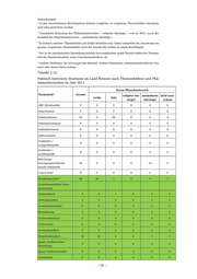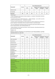 Anmerkungen: 1 In den verschiedenen Berichtsjahren können mögliche, zu vergebene Themenfelder hinzukom- men oder gestrichen werden. 2 Gesonderte Erfassung des Phänomenbereiches − religiöse Ideologie − erst ab 2017, zuvor Be- standteil des Phänomenbereiches − ausländische Ideologie −. 3 Es können mehrere Themenfelder pro Delikt betroffen sein. Daher entspricht die Anzahl der ins- gesamt vergebenen Themenfelder nicht der Anzahl der Delikte in einem Berichtsjahr. 4 Der in der tabellarischen Darstellung farblich hervorgehobene grüne Bereich bildet das Themen- feld der Hasskriminalität, nebst Unterthemenfeldern, ab. ⁵ Umfasst Straftaten, die sich gegen das Internet, weitere Datennetze, informationstechnische Sys- teme oder deren Daten richten. Tabelle 2.12: Politisch motivierte Straftaten im Land Bremen nach Themenfeldern und Phä- nomenbereichen im Jahr 2011 Davon Phänomenbereich Themenfeld1 Gesamt religiöse Ide- ausländische nicht zuzu- rechts links ologie2 Ideologie ordnen ABC-Kriminalität 0 0 0 0 0 0 Anarchismus 7 0 7 0 0 0 Antifaschismus 92 0 92 0 0 0 Antiimperialismus 9 0 9 0 0 0 Antimilitarismus 0 0 0 0 0 0 Antirassismus 4 0 4 0 0 0 Ausländer-/ 0 0 0 0 0 0 Asylproblematik Ausländer-/ 0 0 0 0 0 0 Asylthematik Befreiungs- bewegungen/Interna- 16 0 0 0 16 0 tionale Solidarität Cybercrime⁵ 0 0 0 0 0 0 Hasskriminalität 4 26 24 1 0 0 1 Unterthemenfelder Hass- kriminalität Antisemitisch 7 6 1 0 0 0 Antiziganistisch 0 0 0 0 0 0 Ausländerfeindlich 0 0 0 0 0 0 Behinderung 0 0 0 0 0 0 Christenfeindlich 0 0 0 0 0 0 Cybercrime⁵ 0 0 0 0 0 0 Deutschfeindlich 0 0 0 0 0 0 Fremdenfeindlich 22 22 0 0 0 0 gegen Asylbewerber/ 0 0 0 0 0 0 Flüchtlinge gegen Asylunterkünfte 0 0 0 0 0 0 Geschlecht/ 0 0 0 0 0 0 – 35 –