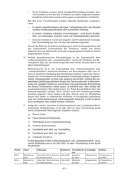— Sechs Verfahren wurden durch sonstige Entscheidung beendet, hier- von handelte es sich bei drei Verfahren um solche aufgrund fremden- feindlicher Motivation (auch solche gegen vermeintliche Ausländer). Bei den neun Verurteilungen wurden folgende Sanktionen ausgespro- chen: — In einem Jugendverfahren mit einer Tatbegehung über das Internet wurden Erziehungsmaßregeln oder Zuchtmittel verhängt. — In sieben Verfahren erfolgten Verurteilungen – auch durch Strafbe- fehl – zu Geldstrafen. Eine der Taten war fremdenfeindlich motiviert. — In einem Verfahren wurde eine Jugend- oder Freiheitsstrafe verhängt. Der Verurteilung lag eine Tat über das Internet zugrunde. Soweit die Zahl der Verfahrenserledigungen nicht deckungsgleich ist mit der vorgenannten Gesamtanzahl der Verfahren, erklärt sich dieses dadurch, dass am Jahresende nicht alle eingegangenen Verfahren bereits abgeschlossen waren. 6. Welche bemerkenswerten Entwicklungen in der Justizstatistik über rechtsextremistisch oder „fremdenfeindlich“ motivierte Straftaten des Be- richtsjahres 2021 hat der Senat festgestellt und welche Gründe sieht er für diese Entwicklungen? Bemerkenswert ist zu der Justizstatistik über rechtsextremistisch oder „fremdenfeindlich“ motivierte Straftaten des Berichtsjahres 2021 zum ei- nen ein deutlicher Rückgang der Ermittlungsverfahren wegen des Tatvor- wurfes des Verwendens von Kennzeichen verfassungswidriger Organisa- tionen. Demgegenüber ist aber zum anderen ein leichter Anstieg der ein- geleiteten Ermittlungsverfahren wegen des Tatvorwurfes der Volksverhet- zung und sonstiger Delikte zu verzeichnen. Die gegenläufige Entwicklung bei diesen Tatbeständen dürfte damit zu erklären sein, dass infolge der pandemiebedingten Einschränkungen die Taten hauptsächlich über das Internet begangen wurden. Zwar werden auch hier verfassungswidrige Symbole gepostet. Diese finden sich aber oftmals auch im öffentlichen Raum. Hier dürfte es während der Pandemie zu Rückgängen gekommen sein. Die Volksverhetzung als Äußerungsdelikt hingegen wurde in dieser Zeit zunehmend über soziale Medien verbreitet. 7. Aufgrund welcher einzelnen rechtsextremistisch und „fremdenfeindlich“ motivierten Straftaten kam es im Jahr 2021 zu einer Verurteilung (auch durch Strafbefehl)? Bitte folgende Angaben machen: a) Tatzeit (Jahr), b) Tatort (Stadtteil/Örtlichkeit), c) Tathergang (kurze Zusammenfassung), d) verletzte Rechtsnormen, e) Geschlecht und Alter von Verurteilten, f) Geschlecht und Alter von Opfern, g) verhängte Sanktion. In den folgenden Fällen rechtsextremistisch und „fremdenfeindlich“ moti- vierter Straftaten kam es im Jahr 2021 zu einer Verurteilung (auch durch Strafbefehl): Tatzeit Tatort Tathergang Rechtsnorm Verurteilte Per- Geschädigte Sanktion son 2019 Bahnhofsvor- „Sieg Heil“-Ruf in Richtung § 86a StGB männlich, Allgemeinheit 70 Tagessätze zu halle von Bahnreisenden 44 Jahre je 10,00 € 2019 Bahnhofsvor- „Sieg Heil“-Ruf in Richtung § 86a StGB männlich, Allgemeinheit 80 Tagessätze zu halle von Bahnreisenden 28 Jahre je 10,00 € – 41 –