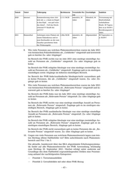— Priorität 3: Sonstige Delikte mit oder ohne PMK-Bezug Bei der letzten Erhebung im September 2021 lagen zu 31 Personen insge- samt 44 Haftbefehle vor. Auf einzelne Personen entfallen hierbei mehrere Haftbefehle wie nachfolgend dargestellt: Personen Haftbefehle je Person Haftbefehle gesamt 3 2 6 1 3 3 1 4 4 1 6 6 Insgesamt verteilen sich die vorgenannten Haftbefehle wie folgt: Personen Phänomenbereich Prio 1 Prio 2 Prio 3 1 PMK-links ./. ./. 1 14 PMK-rechts ./. 5 17 PMK-ausländische Ideo- 2 ./. ./. 2 logie 14 PMK-religiöse Ideologie 7 4 8 ./. PMK-nicht zuzuordnen ./. ./. ./. Wann, mit welchem Haftgrund und wegen welchen Delikts wurden die in der Vorfrage genannten Haftbefehle ausgestellt? Die relevante Datenlage wird nachfolgend tabellarisch dargestellt. PMK Datum Haftgrund Delikt links 29.10.20 Strafvollstreckung § 185 StGB Beleidigung rechts 17.09.21 Strafvollstreckung § 303 Sachbeschädigung rechts 03.05.21 Strafvollstreckung § 263 StGB Betrug rechts 29.04.21 Strafvollstreckung § 113 StGB Widerstand gegen Vollstreckungsbeamte rechts 02.09.21 Strafvollstreckung § 223 StGB Körperverletzung rechts 27.03.21 Strafvollstreckung §142 StGB Unerlaubtes Entfernen vom Unfallort rechts 28.03.21 Strafvollstreckung §123 StGB Hausfriedensbruch rechts 30.03.21 Strafvollstreckung §184 StGB Verbreitung pornographischer Inhalte rechts 26.03.21 Strafvollstreckung §142 StGB Unerlaubtes Entfernen vom Unfallort rechts 28.03.21 Strafvollstreckung u.a. § 168 Störung der Totenruhe rechts 12.07.21 Strafvollstreckung §177 StGB Sexueller Übergriff/Nötigung/Vergewalti- gung rechts 18.08.21 Strafvollstreckung §86a StGB Verwenden von Kennzeichen verfassungs- widriger und terroristischer Organisationen rechts 14.01.21 Strafvollstreckung §243 Besonders schwerer Fall des Diebstahls rechts 18.06.21 Sicherung des Straf- §30 BtmG verfahrens, U-Haft- befehl §§112 StPO ff rechts 29.09.20 Strafvollstreckung §113 StGB Widerstand gegen Vollstreckungsbeamte rechts 18.03.21 Strafvollstreckung §242 Diebstahl rechts 24.09.21 Strafvollstreckung §263 StGB Betrug rechts 27.09.21 Strafvollstreckung §265a StGB Erschleichen von Leistungen rechts 31.08.21 Strafvollstreckung §265a StGB Erschleichen von Leistungen rechts 10.08.21 Strafvollstreckung §113 StGB Widerstand gegen Vollstreckungsbeamte rechts 09.09.21 Strafvollstreckung §242 Diebstahl rechts 17.08.21 Strafvollstreckung §40 SprengG Strafbarer Umgang und Verkehr sowie strafbar Einfuhr rechts 17.08.21 Strafvollstreckung §86a Verwenden von Kennzeichen verfassungswidriger und terroristischer Organisationen – 44 –