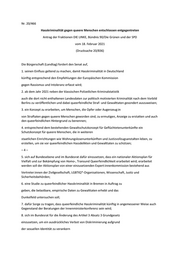 Nr. 20/466 Hasskriminalität gegen queere Menschen entschlossen entgegentreten Antrag der Fraktionen DIE LINKE, Bündnis 90/Die Grünen und der SPD vom 18. Februar 2021 (Drucksache 20/836) Die Bürgerschaft (Landtag) fordert den Senat auf, 1. seinen Einfluss geltend zu machen, damit Hasskriminalität in Deutschland künftig entsprechend den Empfehlungen der Europäischen Kommission gegen Rassismus und Intoleranz erfasst wird; 2. ab dem Jahr 2021 neben der klassischen Polizeilichen Kriminalstatistik auch die dort nicht enthaltenen Landesdaten zur politisch motivierten Kriminalität nach dem Vorbild Berlins zu veröffentlichen und dabei queerfeindliche Straf- und Gewalttaten gesondert auszuweisen; 3. ein Konzept zu erarbeiten, um Menschen, die Opfer oder Augenzeug:in von Straftaten gegen queere Menschen geworden sind, zu ermutigen, Anzeige zu erstatten und auch den queerfeindlichen Hintergrund zu benennen; 4. entsprechend dem bestehenden Gewaltschutzkonzept für Geflüchtetenunterkünfte ein Schutzkonzept für queere Menschen, die in weiteren staatlichen Einrichtungen wie Wohnungslosenunterkünften und Justizvollzugsanstalten leben, zu erstellen, um sie vor queerfeindlichen Hassdelikten und Gewalttaten zu schützen; –4– 5. sich auf Bundesebene und im Bundesrat dafür einzusetzen, dass ein nationaler Aktionsplan für Vielfalt und zur Bekämpfung von Homo-, Transund Queerfeindlichkeit erarbeitet wird; erarbeitet werden soll der Aktionsplan von einer einzusetzenden Expert:innenkommission bestehend aus Vertreter:innen der Zivilgesellschaft, LGBTIQ*-Organisationen, Wissenschaft, Justiz und Sicherheitsbehörden; 6. eine Studie zu queerfeindlicher Hasskriminalität in Bremen in Auftrag zu geben, die belastbare, empirische Daten zu Gewalttaten erhebt und das Dunkelfeld untersuchen soll; 7. dafür Sorge zu tragen, dass queerfeindliche Hasskriminalität künftig in angemessener Weise auch Gegenstand der Beratungen der Innenministerkonferenz sein wird; 8. sich im Bundesrat für die Änderung des Artikel 3 Absatz 3 Grundgesetz einzusetzen, um ein ausdrückliches Verbot von Diskriminierung aufgrund der sexuellen Identität zu verankern