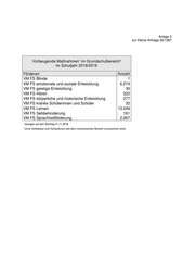 Anlage 2 zur Kleine Anfrage 20/1387 Vorbeugende Maßnahmen¹ im Grundschulbereich² im Schuljahr 2018/2019 Förderart Anzahl VM FS Blinde 1 VM FS emotionale und soziale Entwicklung 6.274 VM FS geistige Entwicklung 30 VM FS Hören 322 VM FS körperliche und motorische Entwicklung 277 VM FS kranke Schülerinnen und Schüler 32 VM FS Lernen 13.249 VM FS Sehbehinderung 161 VM FS Sprachheilförderung 2.907 ¹ bezogen auf den Stichtag 01.11.2018 ¹ ohne Vorklassen und Vorlaufkurse (die dem vorschulischen Bereich zuzurechnen sind)