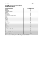 Drs. 20/352 Anlage 2 Anzahl EU-Bürger nach Staatsangehörigkeit Hier: Bundesland Hessen Staatsangehörigkeit Anzahl Personen Belgien 8 Bulgarien 161 Dänemark u. Färöer 1 Estland 3 Frankreich 11 Griechenland 25 Großbritannien mit Nordirland 14 Irland 1 Italien 70 Kroatien 23 Lettland 19 Litauen 76 Luxemburg 1 Niederlande 25 Österreich 2 Polen 114 Portugal 8 Rumänien 356 Schweden 1 Slowakische Republik 17 Slowenien 5 Spanien 64 Tschechische Republik 12 Ungarn 14 Gesamt - Summe 1.031 Quelle: Bundesamt für Migration und Flüchtlinge; Stand 31.03.2019