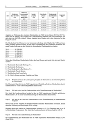 2 Hessischer Landtag · 20. Wahlperiode · Drucksache 20/337 Mittel aus Förderung Kommunalem Sonder- Freie Musik- Förderung der Insgesamt Jahr über den VdM Finanzaus- projekte schulen Geschäftsstelle in € in € gleich (KFA) in € in € in € in € 2013 1.454.500,00 200.000,00 132.900,00 22.500,00 170.000 1.979.900,00 2014 1.454.500,00 200.000,00 132.900,00 23.000,00 170.000 1.980.400,00 2015 1.879.000,00 200.000,00 196.608,00 27.300,00 177.500 2.480.408,00 2016 1.934.000,00 300.000,00 192.900,00 30.000,00 177.500 2.634.400,00 2017 2.079.000,00 300.000,00 192.900,00 30.000,00 177.500 2.779.400,00 Angaben zur Förderung der einzelnen Musikschulen im VdM in den Jahren 2013 bis 2017 be- finden sich im Anhang. Die Angaben zur Landesförderung enthalten zum Teil Förderungen, die nicht über das HMWK erfolgen. Nähere Angaben hierzu finden sich in den Antworten zu den Fragen 9 und 10. Die Musikschule Groß-Gerau ist zwar kommunal, allerdings nicht Mitglied des VdM und muss daher gesondert genannt werden. Sie hat unter Zugrundelegung des Frankfurter Schlüssels fol- gende Landesförderung aus den Mitteln des Kommunalen Finanzausgleichs erhalten: 2013: ...........10.700,00 €, 2014: ...........10.700,00 €, 2015: ........... 8.400,00 €, 2016: .......... 12.535,00 €, 2017: ...........12.027,00 €. Neben den öffentlichen Musikschulen fördert das Land Hessen auch sechs freie (private) Musik- schulen: 1. Musikschule Darmstadt-Dieburg e.V., 2. Musikschule Hochtaunus, 3. Freie Musikschule in Bad Soden e.V., 4. Musikschule Piccolo Idstein, 5. Musikkulturschule Lauterbach, 6. Dr. Hoch‘s Konservatorium, Frankfurt am Main. Frage 3. Welche Kenntnis hat die Landesregierung bezüglich des Elternanteils an den Unterrichtsgebühren der Musikschulen? Der Elternanteil liegt bei den im VdM organisierten öffentlich geförderten Musikschulen durch- schnittlich bei 61 % der Unterrichtsgebühren (Stand 2016). Frage 4. Wie hoch ist der Anteil der Landeszuschüsse an der Gesamtfinanzierung der Musikschulen? Der Anteil der Landeszuschüsse beträgt bei den im VdM organisierten öffentlich geförderten Musikschulen 4,16 % an der Gesamtfinanzierung der Musikschulen (Stand 2016). Frage 5. Wie hoch ist der Anteil der Landeszuschüsse an der Gesamtfinanzierung im bundesdeutschen Vergleich? Hierzu wird auf die Angaben des Bundesverbandes deutscher Musikschulen verwiesen, dessen aktuellste Erhebung zum Berichtsjahr 2016 vorliegt. Demnach liegen die Anteile der Landeszuschüsse zwischen 1,13 % in Thüringen und 19,14 % in Mecklenburg-Vorpommern. Der Anteil des Landeszuschusses in Hessen liegt bei 4,06 %. Frage 6. Wie hoch ist die Landesförderung pro Musikschüler? Die Landesförderung pro Musikschüler der im VdM organisierten Musikschulen beträgt 21,24 € (Stand 2016).