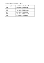 Kleine Anfrage 20/2040, Anlage 2 (Frage 2) Auswertungsjahr Anzahl der Tatverdächtigen (TV) 2014 1.862 – davon 1.050 deutsche TV 2015 1.893 – davon 957 deutsche TV 2016 2.143 – davon 1.024 deutsche TV 2017 2.251 – davon 1.103 deutsche TV 2018 2.256 – davon 1.093 deutsche TV 2019 2.072 – davon 977 deutsche TV