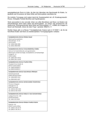 Hessischer Landtag · 20. Wahlperiode · Drucksache 20/740 3 gemeinpädiatrische Praxis in Lollar, die über drei Jahrzehnte eine Sprechstunde für Kinder, Ju- gendliche und Erwachsene mit Spina bifida und Hydrocephalus unterhalten hat. Die ärztliche Versorgung wird ergänzt durch die Zusammenarbeit mit z.B. Krankengymnastik- Praxen, Orthopädie-Technik-Betrieben und Ergotherapeuten. Nicht unwesentlich ist die wertvolle Arbeit von selbst Betroffenen und Eltern von Kindern mit Einschränkungen durch Spina bifida und Hydrocephalus. Zu nennen sind beispielsweise die bundesweite Arbeitsgemeinschaft Spina bifida und Hydrocephalus e.V. (ASBH) mit Gruppen in Kassel und Darmstadt, ebenso die unter Frage 1 genannte ARQUE e.V. Darüber hinaus gibt es in Hessen 7 Sozialpädiatrische Zentren nach § 119 SGB V, die für die betroffenen Kinder und Eltern ein multidisziplinäres Versorgungsangebot vorhalten: Sozialpädiatrisches Zentrum Klinikum Kassel Abteilung Neuropädiatrie Mönchbergstr. 41-43 34125 Kassel Tel.: (0561) 980-3096 Fax: (0561) 980-6946 Sozialpädiatrisches Zentrum Universitätsklinikum Gießen Zentrum für Kinderheilkunde und Jugendmedizin Abteilung für Kinderneurologie, Sozialpädiatrie und Epileptologie Feulgenstr. 12 35392 Gießen Tel.: (0641) 99-4 34 61 Fax: (0641) 99-4 34 89 Sozialpädiatrisches Zentrum Frankfurt Mitte Theobald-Christ-Straße 16 60316 Frankfurt/Main Tel.: (069) 9434095-0 Fax: (069) 9434095-9 Sozialpädiatrisches Zentrum Sana Klinikum Offenbach Starkenburgring 66 63069 Offenbach/Main Tel.: (069) 8405-4322 Fax: (069) 8405-4447 Sozialpädiatrisches Zentrum derDarmstädter Kinderkliniken Prinzessin Margaret Dieburger Str. 31 64287 Darmstadt Tel.: (06151) 402-3202 Fax: (06151) 402-3019 Sozialpädiatrisches Zentrum Helios Dr. Horst Schmidt Kliniken Ludwig-Erhard-Str. 100 65199 Wiesbaden Tel.: (0611) 43-2918 Sozialpädiatrisches Zentrum Klinikum Frankfurt Höchst Gotenstr. 6-8 65929 Frankfurt/Main Tel.: (069) 31 06-20 70 Fax: (069) 31 06-28 21