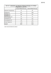 20. Wahlperiode Drucksache 20/3142 HESSISCHER LANDTAG 15. 09. 2020 Kleine Anfrage Dr. Daniela Sommer (SPD) vom 01.07.2020 Qualifizierung Arbeitsloser für die Altenpflege und Antwort Minister für Soziales und Integration Vorbemerkung Fragesteller: Die Arbeitsagenturen und Jobcenter leisten einen Beitrag zur Qualifizierung von Altenpflegepersonal. Diese Vorbemerkung der Fragestellerin vorangestellt, beantworte ich die Kleine Anfrage im Ein- vernehmen mit dem Chef der Staatskanzlei wie folgt: Frage 1. Wie viele Personen arbeiten in der Altenpflege? Die Statistik der Bundesagentur für Arbeit weist zum Stand Juni 2020 für den Beruf Altenpflege 44.191 sozialversicherungspflichtig Beschäftigte in Hessen aus. Diese Zahl bezieht sich aus- schließlich auf die Berufskennziffer 821 Altenpflege. Die Daten der Hessischen Pflegestatistik (2017), die im Hessischen Pflegemonitor veröffentlicht werden, weisen die Beschäftigtenzahlen dagegen für alle einschlägigen Abschlüsse (Gesundheits- und Krankenpflege, Altenpflege, Krankenpflegehilfe und Altenpflegehilfe) sowie sonstige Pfle- gekräfte (angelernte) aus. Demnach waren im Jahr 2017 im Bereich der stationären und ambulan- ten Langzeitpflege (ambulante Dienste und stationäre Altenpflegeeinrichtungen) insgesamt 80.120 Pflegekräfte beschäftigt (siehe Anlage 1). Neue Daten für 2019 liegen seitens des Hessischen Statistischen Landesamtes noch nicht ausgewertet vor. Frage 2. Wie viele Stellen sind derzeit in der Altenpflege vakant? Nach der Statistik der Bundesagentur für Arbeit waren zum Stand Juni 2020 in Hessen 1.399 offene Stellen gemeldet. Frage 3. Wie viele Personen melden sich auf diese vakanten Stellen? Wie viele Personen sich über die Bundesagentur auf die gemeldeten offenen Stellen beworben haben, wird in der öffentlichen Arbeitsmarktstatistik nicht erfasst. Nach der Statistik der Bundesagentur für Arbeit waren zum Stand Juni 2020 in Hessen für die Berufskennziffer 821 (Altenpflege) 3.109 Personen arbeitslos bei den Agenturen für Arbeit ge- meldet. Frage 4. Wie bewertet die Landesregierung die Ausbildungskapazität in Hessen und welche Kapazitätser- weiterungen in der generalistischen Ausbildung sind zukünftig geplant? Die Ausbildungskapazitäten sind in den letzten Jahren kontinuierlich gewachsen und müssen an- gesichts des demografischen Wandels weiterwachsen. Das Angebot von Absolventinnen und Ab- solventen und von arbeitslos gemeldeten Pflegefachkräften reicht nicht aus, um die stetig steigende Nachfrage nach Fachkräften im Arbeitsmarkt Pflege zu decken. Eingegangen am 15. September 2020 · Bearbeitet am 15. September 2020 · Ausgegeben am 17. September 2020 Herstellung: Kanzlei des Hessischen Landtags · Postfach 3240 · 65022 Wiesbaden · www.Hessischer-Landtag.de